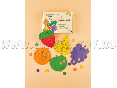 Деревянная развивающая игрушка из 5 деревянных рамок-вкладышей в виде фруктов с отверстиями для сортировки по цветам. Деревянные фигуры в виде вкусных и сочных фруктов: яблока, груши, винограда, клубники, апельсина, - могут надолго увлечь малыша. Каждая фигура имеет отверстия, которые заполняются цветными кружками соответствующего цвета. Мозаика помогает развивать зрительное восприятие, тактильные функции, зрительную координацию, логическое и пространственное мышление.