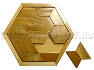 В шестигранной рамке этой головоломки расположены 9 элементов различной формы. Игра позволяет решить две довольно сложные задачки, причем каждая из них имеет по несколько решений.