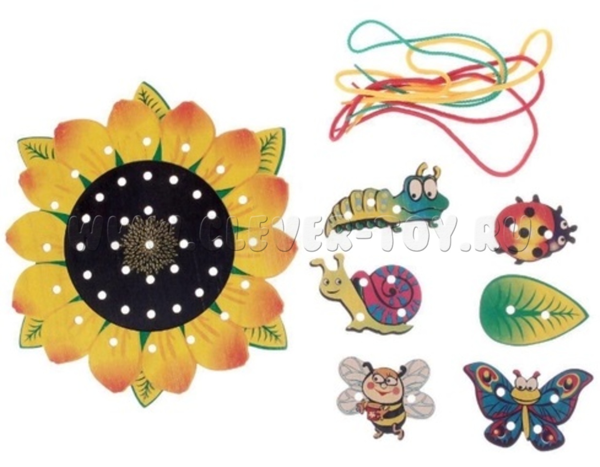 Играя в шнуровку-подсолнух, вы можете придумать сказку, о том откуда прилетел на него листик, или же как на него заползла улитка, для чего на него прилетела пчела? и другое.