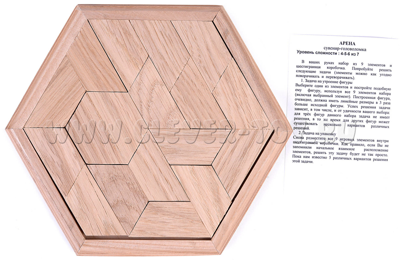 "Арена" предлагает игрокам две различные задачи: первая заключается в том, чтобы разместить все элементы внутри шестигранной коробки, а вторая - увеличить размеры выбранной фигуры в 3 раза, используя все другие элементы. Уровень сложности игры зависит от выбранной задачи.