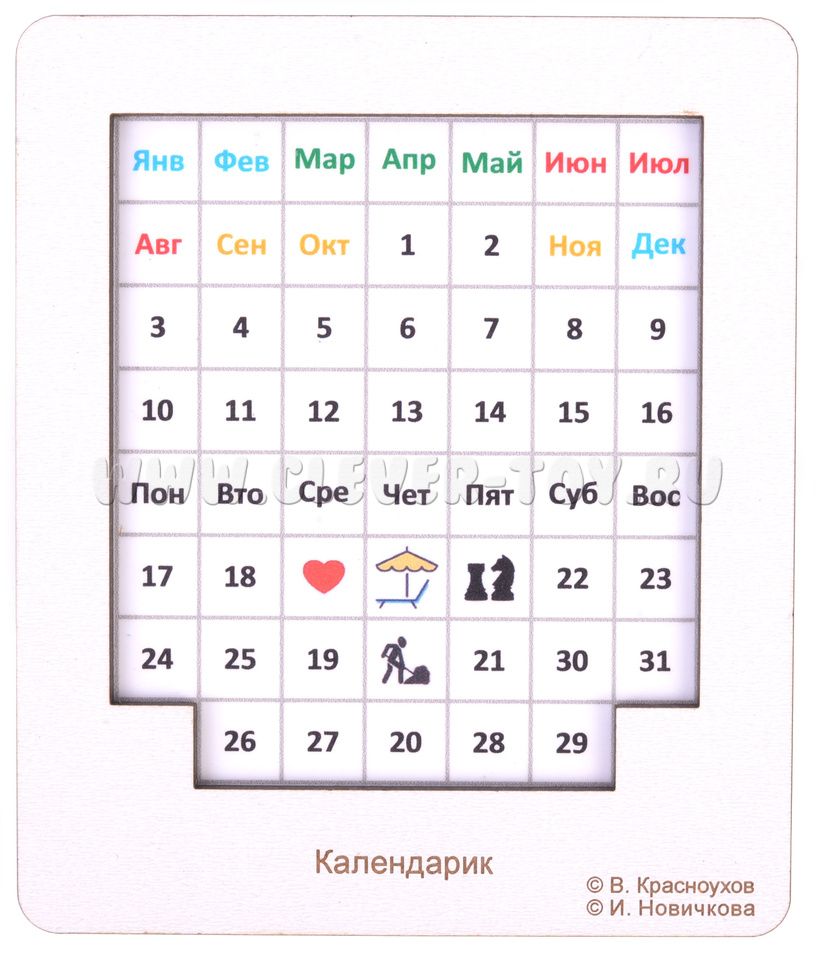 Задача. Уложите детали головоломки так, чтобы непокрытыми остались 4 окошка - одно с числом, одно с месяцем, одно - с днём недели и одно с планируемым родом занятий:"работа","спорт","встреча","отдых".