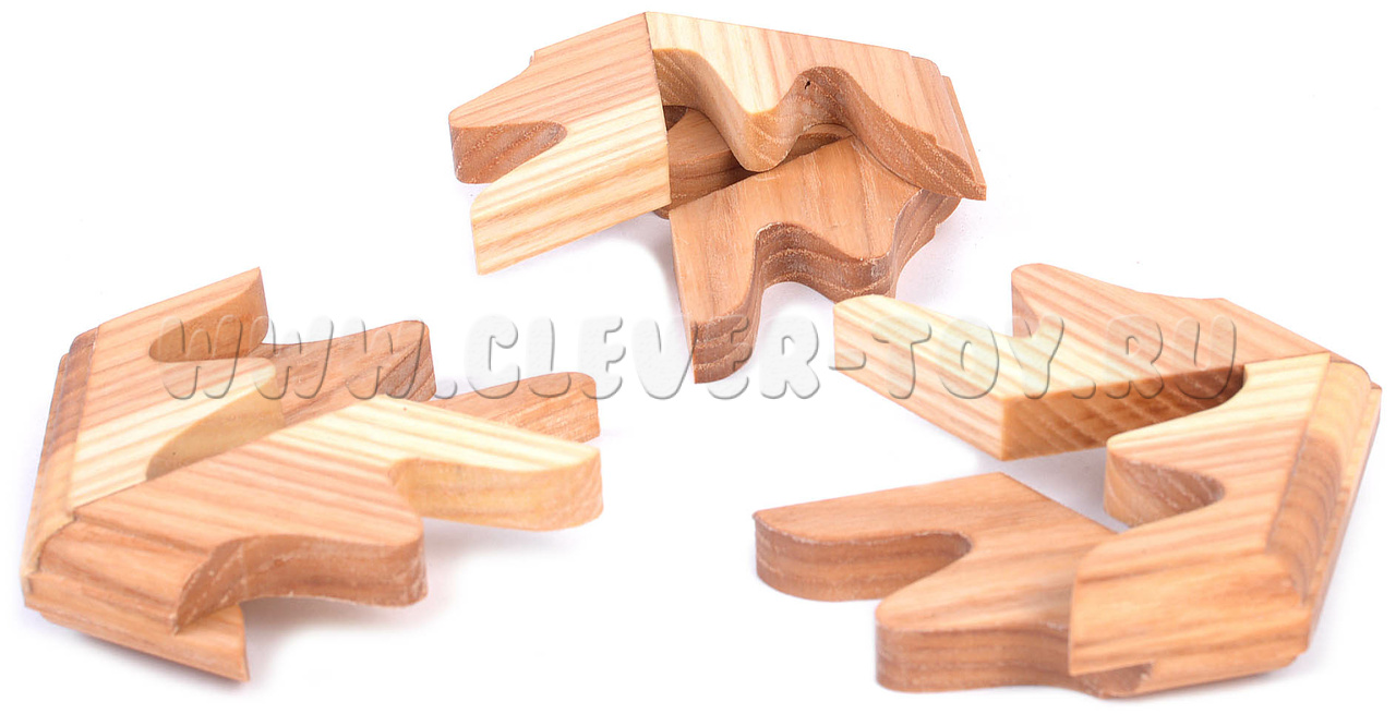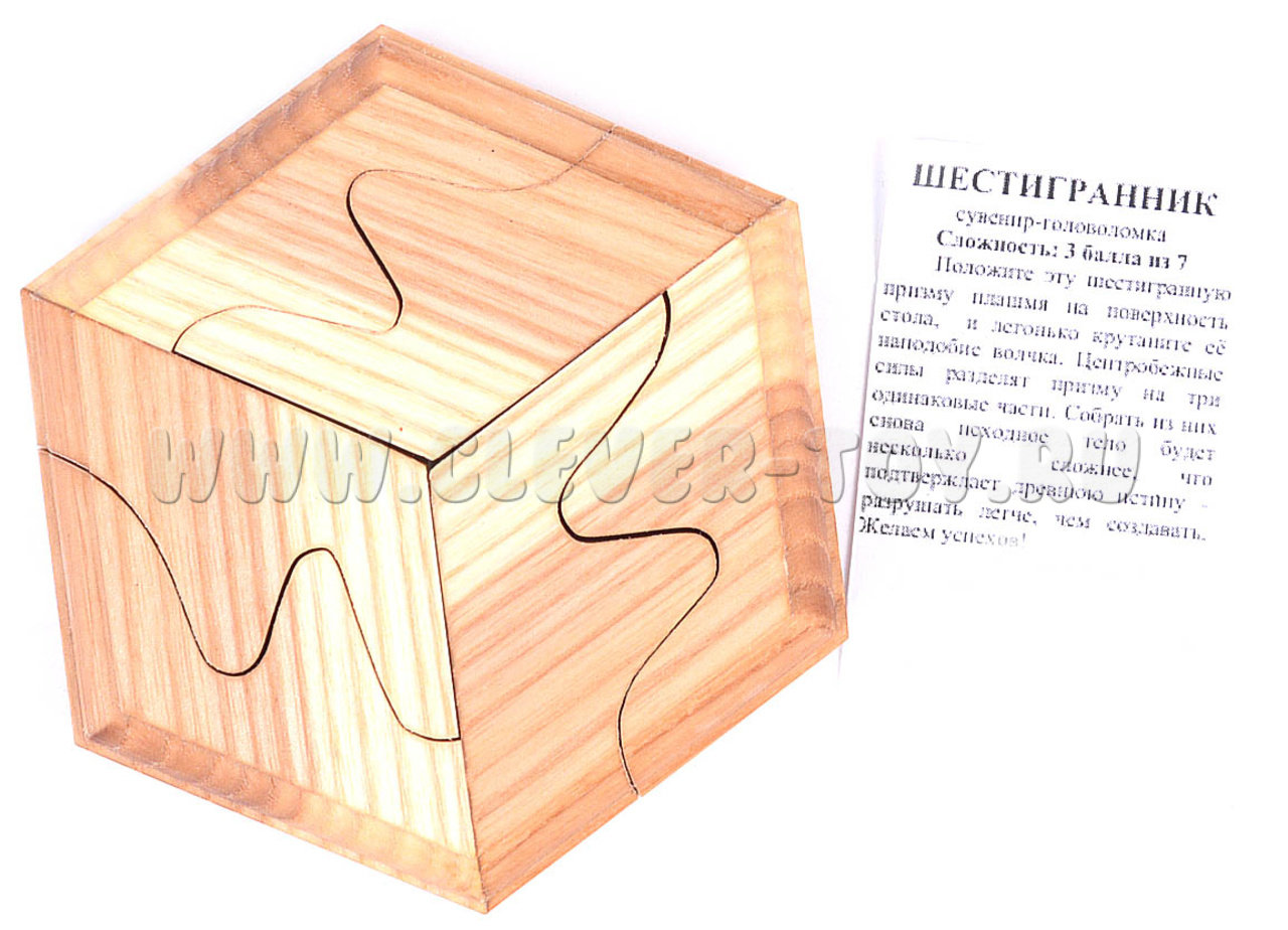Если положить эту шестигранную призму плашмя на поверхность стола, и легонько крутануть её как волчок, то благодаря центробежным силам головоломка разделится на три одинаковые части. Попробуйте собрать из них исходное тело - это будет не так уж и просто, ведь создавать сложнее, чем разрушать.