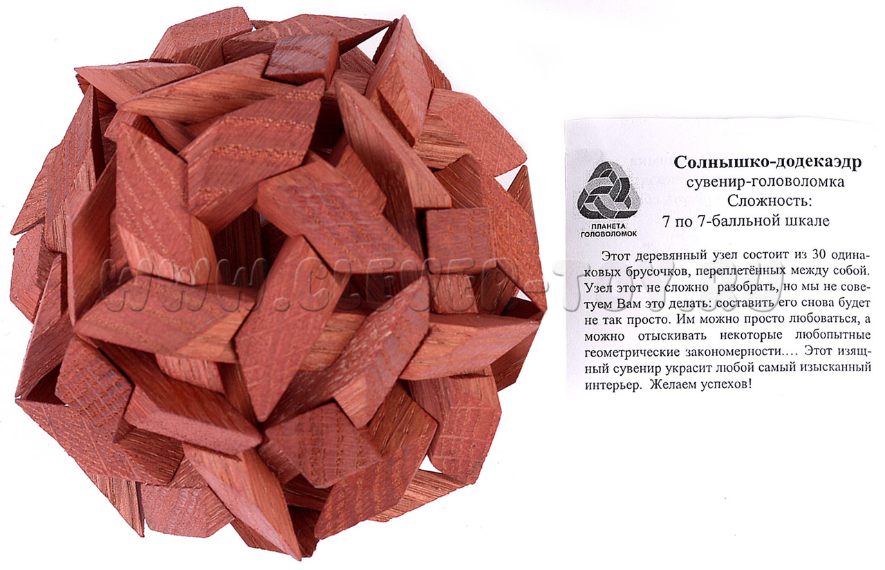 Солнышко-додекаэдр – сложнейшая деревянная головоломка. Испытайте свои силы в решении логических задач или можете оставить головоломку как любопытный сувенир.