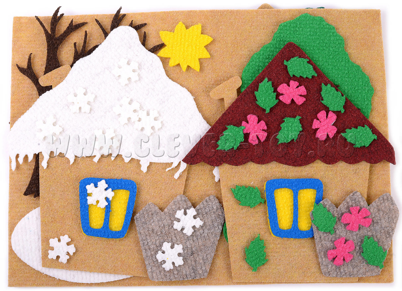 • снежинки, листочки зелёные и жёлтые, разноцветные цветочки облака, солнышки – 4 шт.;