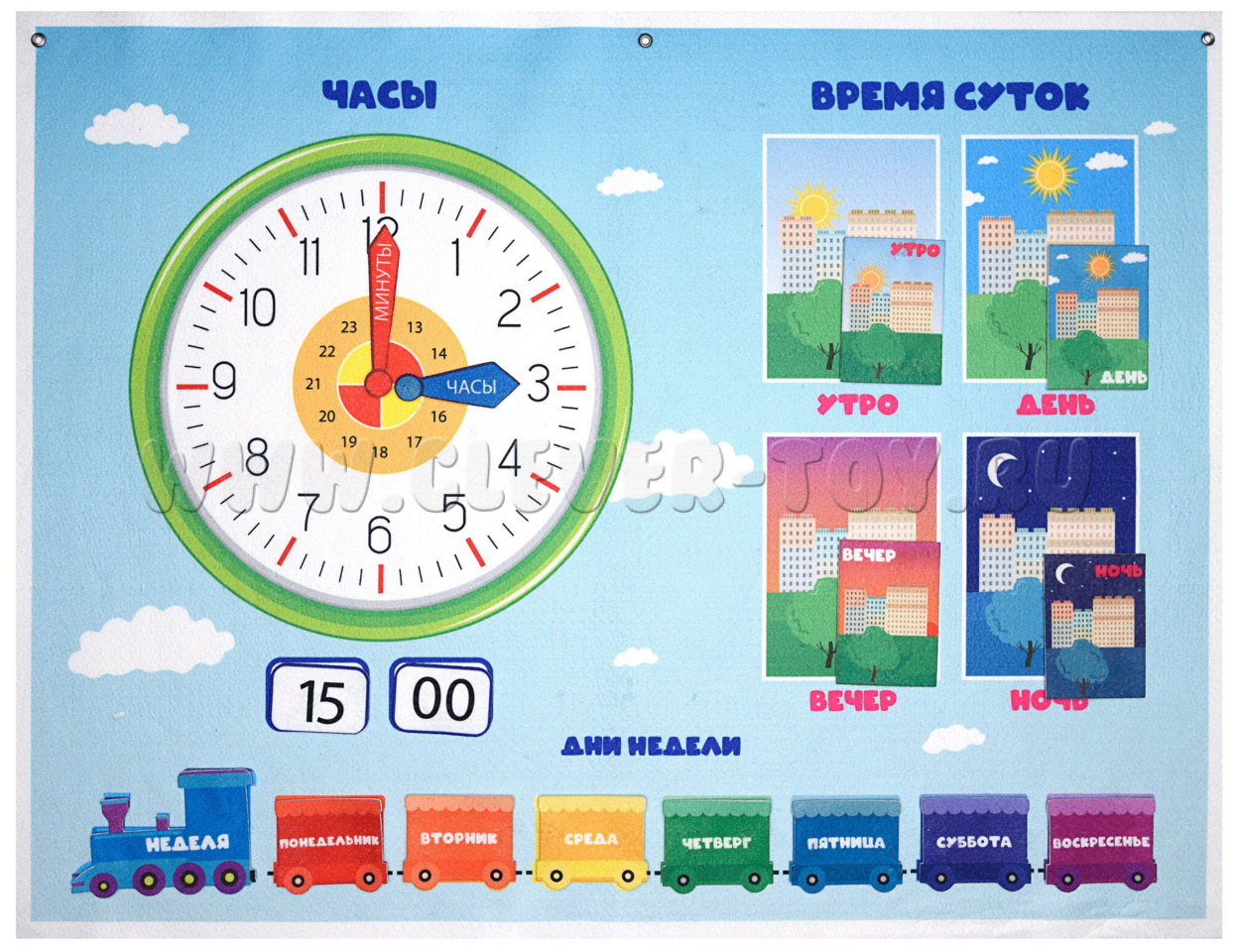 Игра «Часы и время» — это обучающее панно, которое поможет детям познакомиться с понятием времени и научиться ориентироваться во временных рамках.