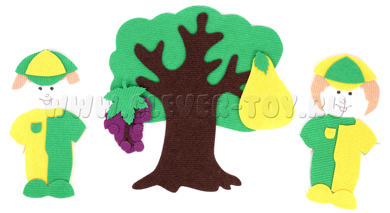 - герои – мальчик и девочка (каждый по 25*15 см); предметы – трактор (20*15 см), дерево (30*30 см), корзина (26*26 см);
