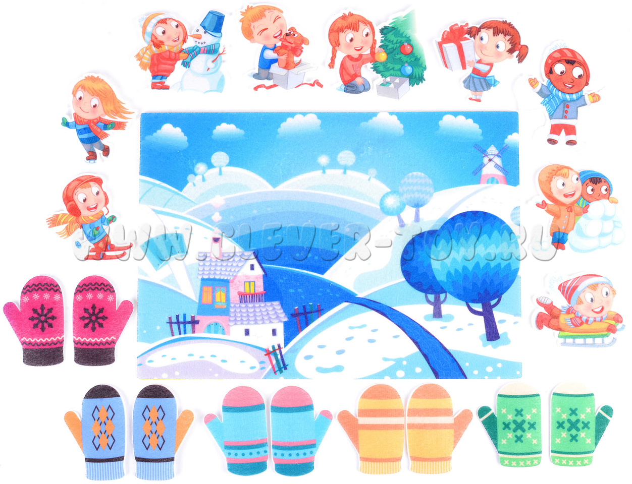 • Фигурки детей, иллюстрирующих зимние занятия: девочка со снеговиком, мальчишки, играющие в снежки, паренек, валяющийся в снегу, мальчишка, мчащийся на санках, паренек на лыжах, мальчик, радующийся подаренному щенку, девчонка с подарком, девчушка, катающаяся на коньках, и девочка, наряжающая елку (9 шт.);
