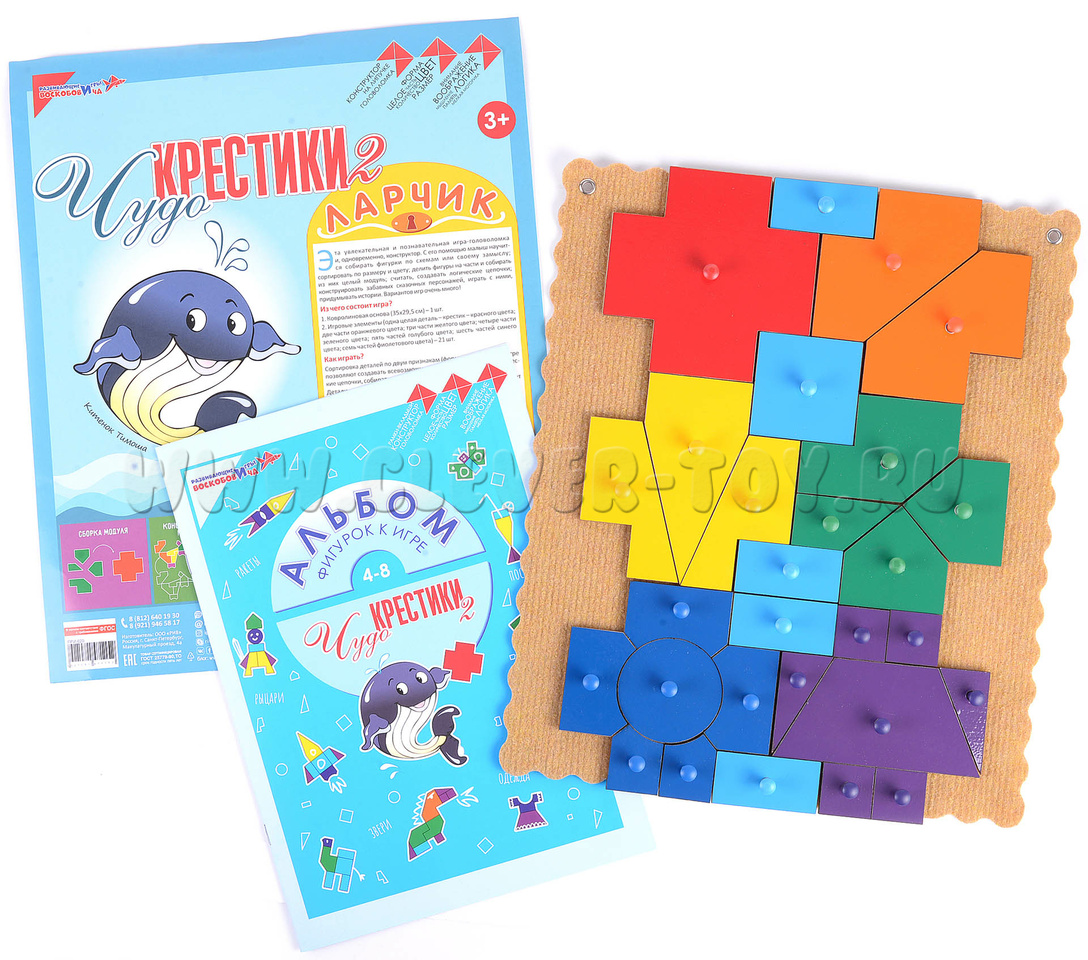 Крупные, яркие деревянные детали игрового пособия разделены на различные геометрические фигуры разной формы и величины, которые образуют 7 разноцветных крестиков. Из этих деталей ребёнок с помощью методических рекомендаций и подсказок взрослого может складывать фигуры: