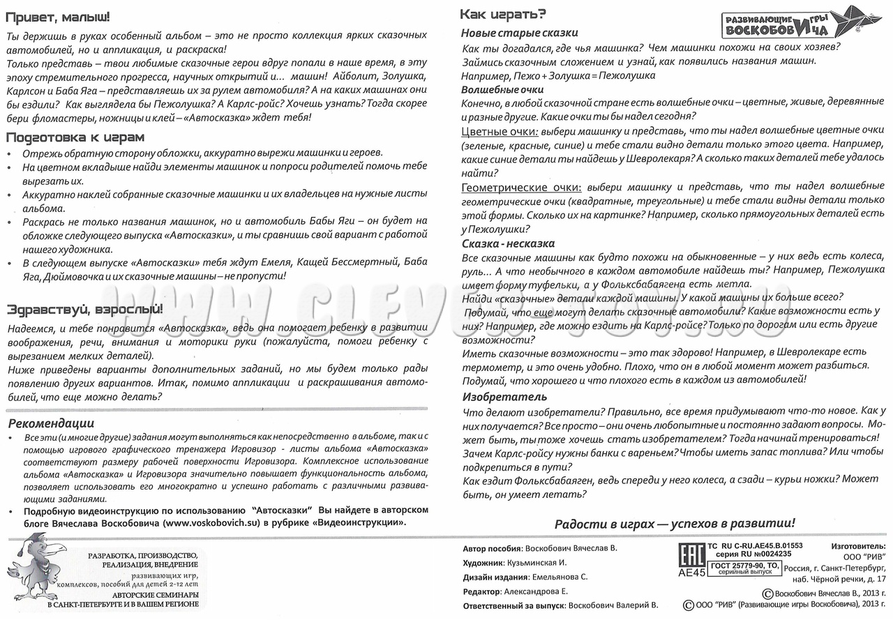 Подробную видеоинструкцию по использованию «Автосказки» Вы найдете в авторском блоге Вячеслава Воскобовича (www.voskobovich.su)в рубрике «видеоинструкции».