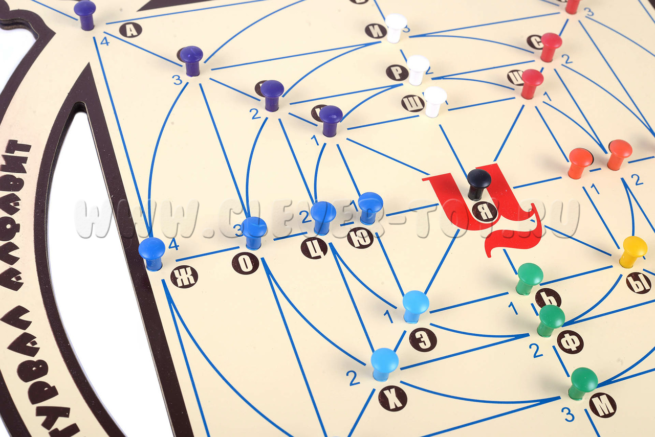 При помощи координатной сетки, гвоздиков с «именами» и разноцветных резинок ребёнок научится создавать фигуры по схемам и координатам, придумывать свои фигуры, трансформировать геометрические фигуры, шифровать их, находить отражение фигур в зеркале и т.д.