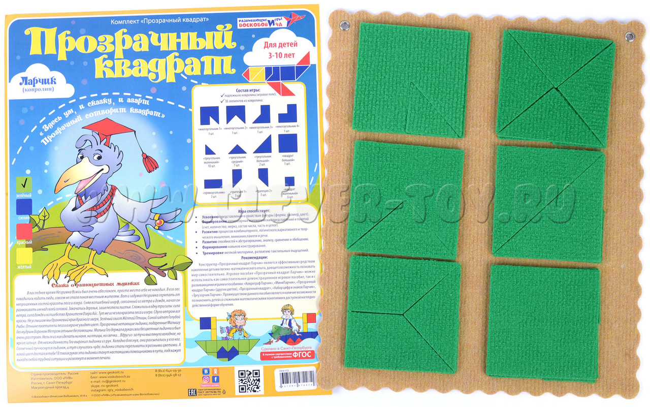 Конструктор «Прозрачный квадрат Ларчик» - эффективное средство накопления детьми логико-математического опыта, дающего возможность познавать мир самостоятельно. Игровое пособие можно использовать как самостоятельно, так и с развивающими играми и пособиями: «Коврограф Ларчик», «МиниЛарчик», «Прозрачный квадрат Ларчик (других цветов)», «Прозрачный квадрат», «Набор цифр и знаков Ларчик», «Треузорчик Ларчик».