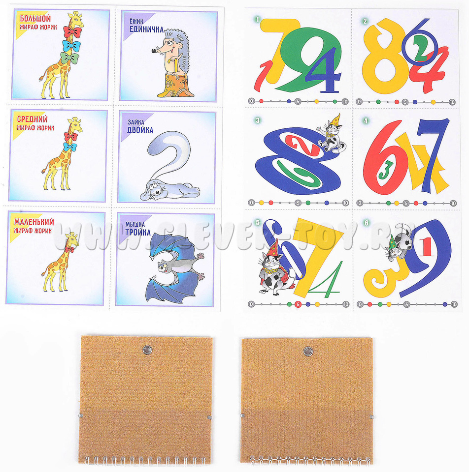 1. 48 картонных карточек (105х100 мм): 24 игровых с цифрами (от 1 до 9), 24 призовых, обозначающих цвет, размер, положение (предлог),
