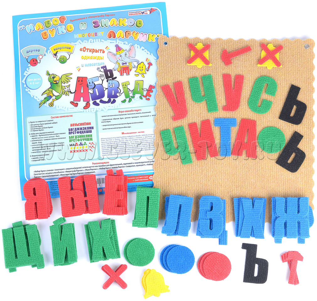 «Набор букв и знаков» используется как пособие для групповой и индивидуальной работы с детьми в детских садах, развивающих центрах или в домашних условиях. Сочетается с играми и пособиями: «Коврограф Ларчик», «МиниЛарчик», «Фиолетовый лес», «Набор цифр и знаков Ларчик» (ковролин, одноцвет), «Конструктор букв Ларчик» (ковролин). Разработан в полном соответствии с ФГОС.