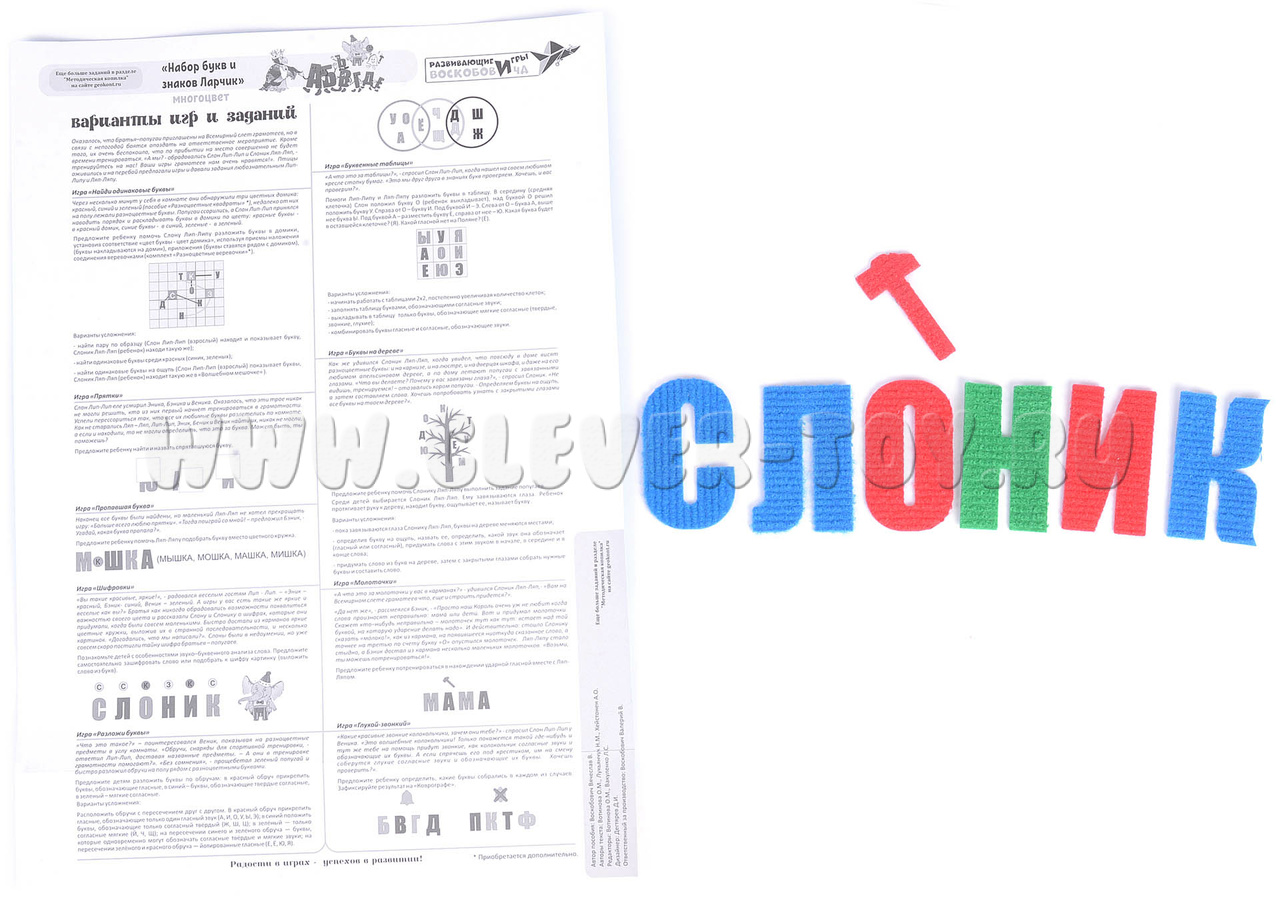 В комплект также входит инструкция с подробным описанием развивающих игр и занятий (с использованием других приложений серии «Ларчик»), в том числе: