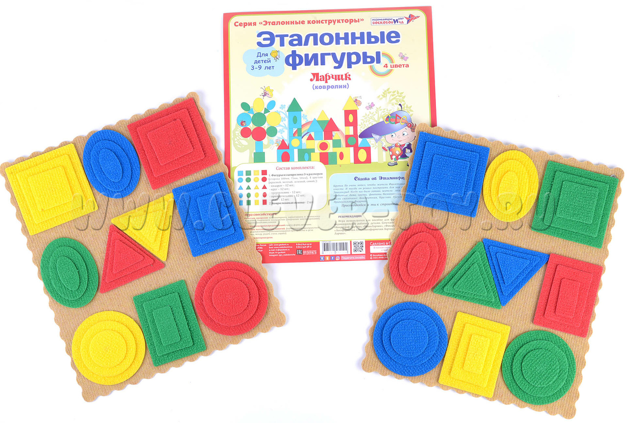 Разноцветные геометрические фигуры выполнены из безопасного современного материала – ковролина, аккуратно вырезаны на специальном станке, легко крепятся на ковролиную игровую основу с помощью многоразовых липучек.