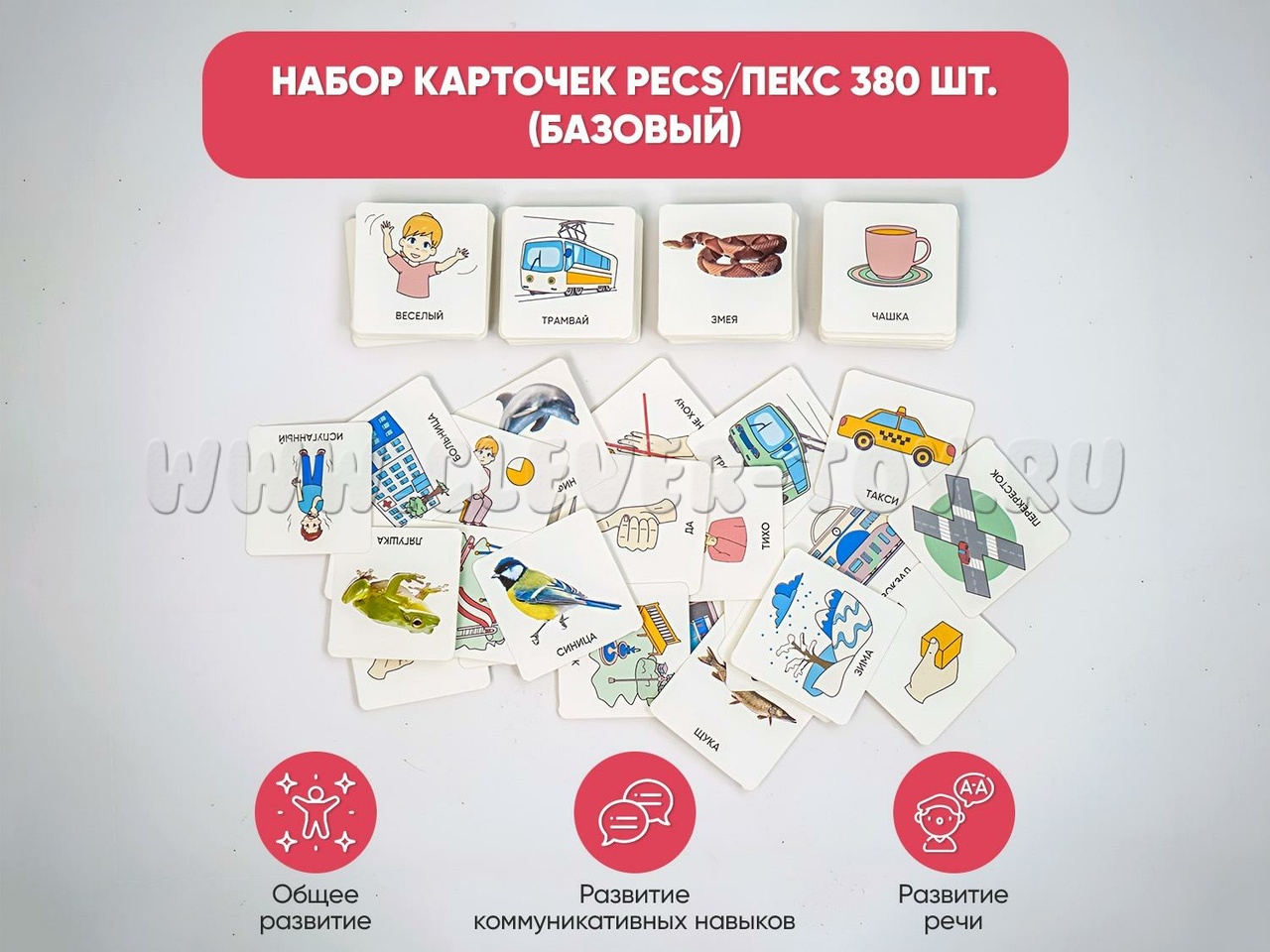 • Набор карточек индивидуально подбирается под каждого ребёнка, учитывая его особые потребности. С возрастом и развитием умений набор карточек может расширяться. Для некоторых людей карточки PECS /ПЕКС могут быть средством общения на протяжении всей жизни.