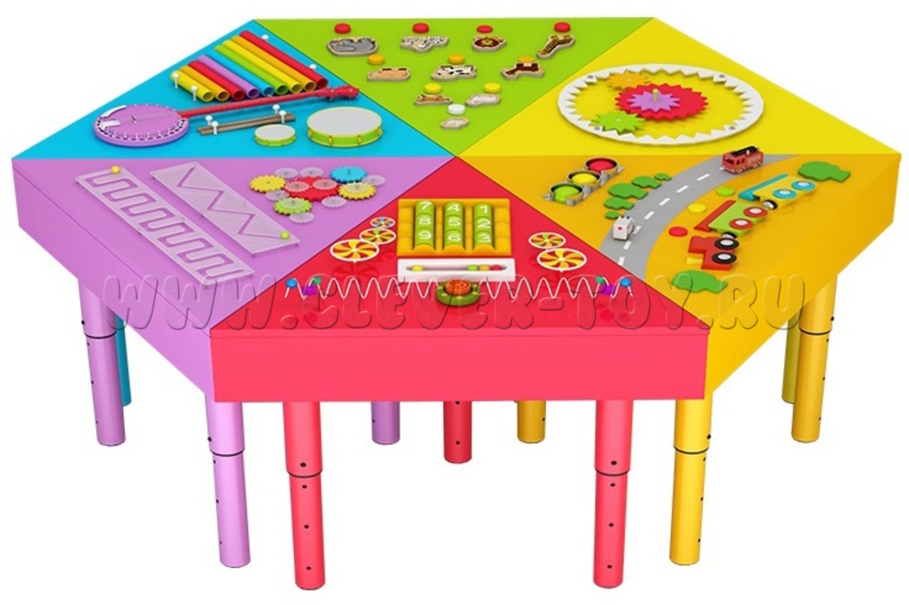В каждый столик встроен световой планшет для рисования песком, а по периметру расположены отсеки для кинетического, космического песка, формочек и фигурок. Крышки столов имеют с одной стороны маркерную поверхность, на которой дети могут писать, рисовать, лепить, изучать цифры и буквы, играть, собирать пазлы и.т.д. С другой стороны крышки расположена тактильная поверхность с различными замочками, шнуровками, головоломками. Каждому ребенку будет удобно и комфортно, так как в основе столов телескопические ножки, с помощью которых будет легко подобрать оптимальную высоту, даже если в группе дети разного возраста и роста.