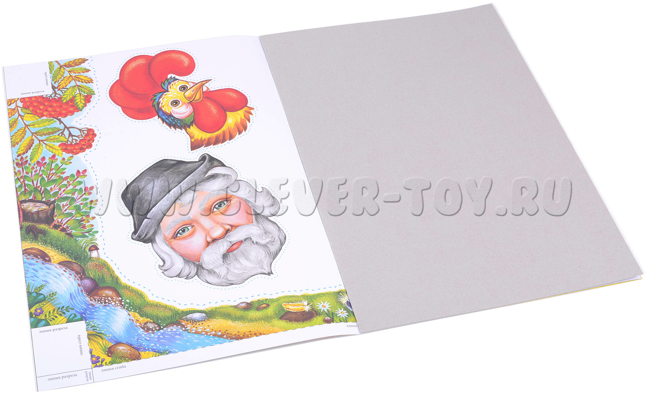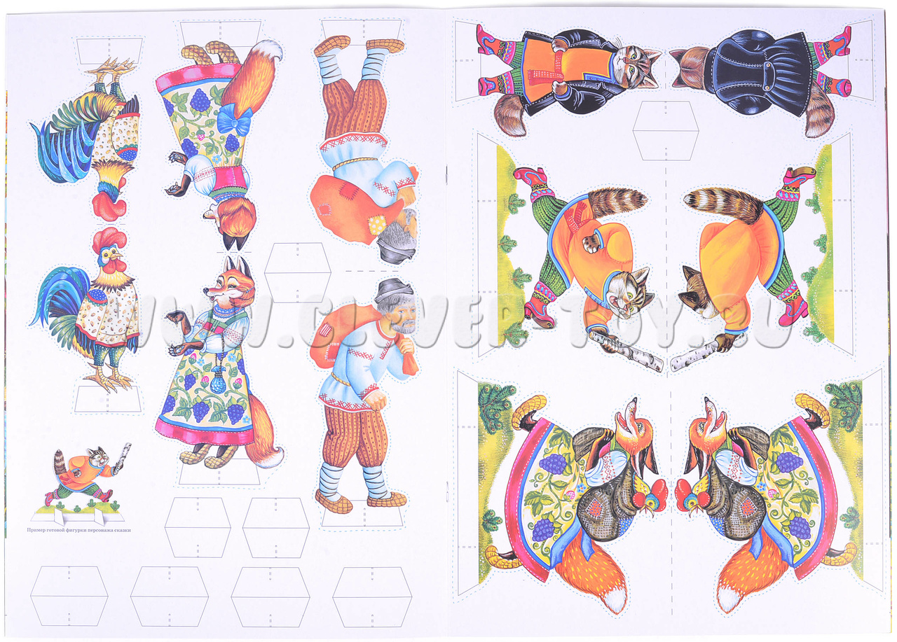 • Фигурки-персонажи которые изготовлены из плотного картона всего 6 ярко выполненных фигурок (петух, лиса(2), старик, кот(2)). Ребенок должен вырезать данные фигурки по пунктирным линиям, согнуть пополам и склеить клеем;