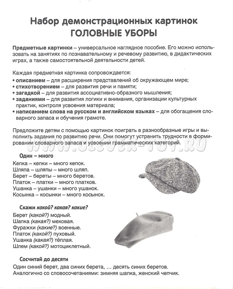 Набор карточек "Головные уборы"- это 16 демонстрационных картинок для познавательного и речевого развития. На обороте каждой предметной картинки - описание, вопросы для ребёнка, название на русском и английском языках.