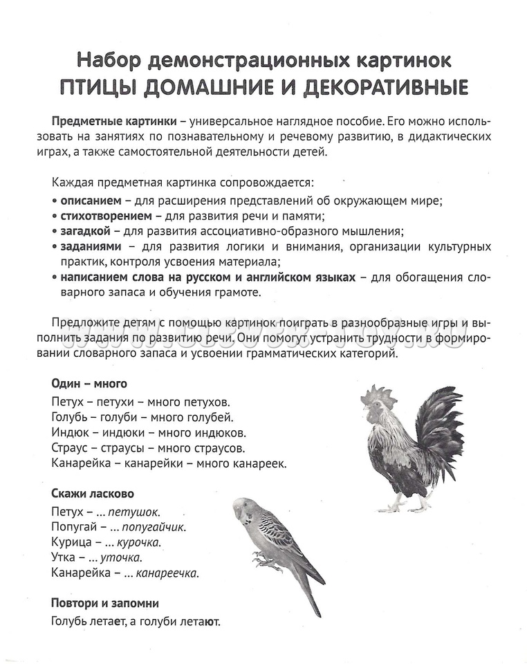 Набор карточек "Птицы домашние и декоративные" состоит из бесед, стихотворений, загадок и вопросов по теме. Комплект включает 16 цветных демонстрационных картинок с текстом на обороте, названия тем имеют перевод на английский язык.