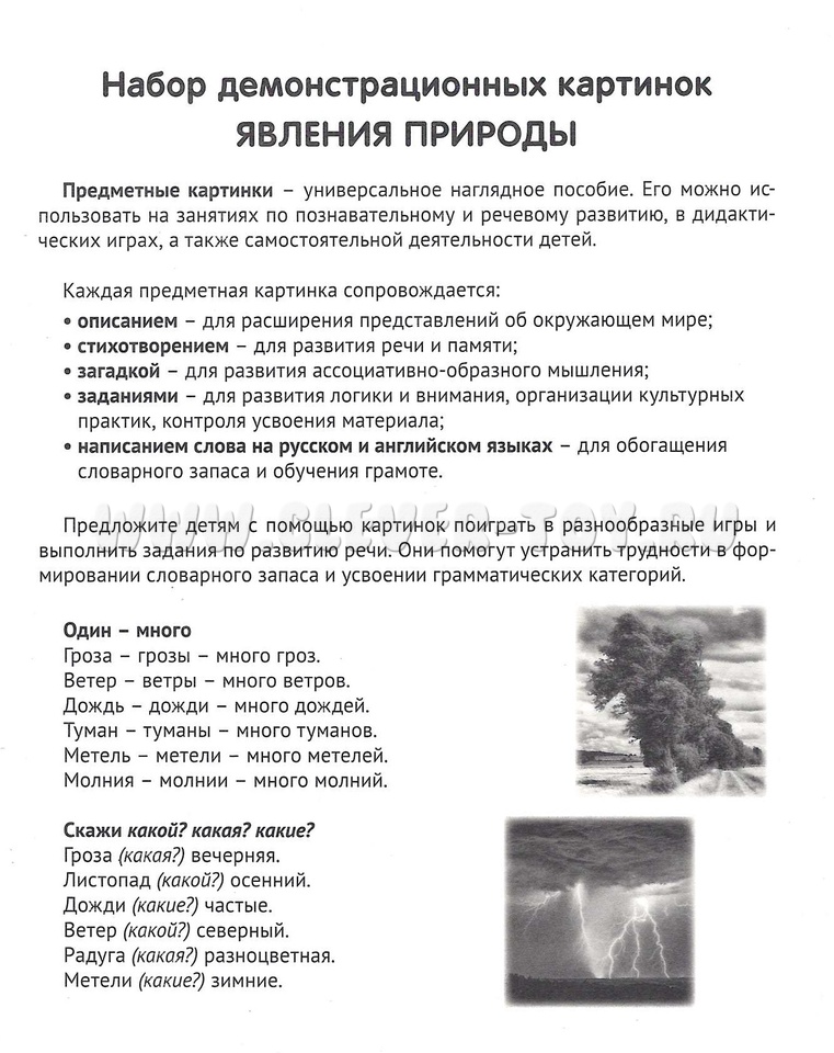 На лицевой стороне каждой карточки изображено явление природы, а на обратной - подробное описание. Дети узнают много интересного и поучительного о том, как возникают и проявляются различные природные явления.