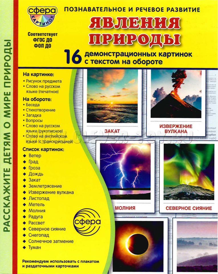 Издательство "ТЦ Сфера" представляет серию "Сфера картинок" под названием "Явления природы". В комплект входят 16 цветных демонстрационных карточек с описанием различных природных явлений.