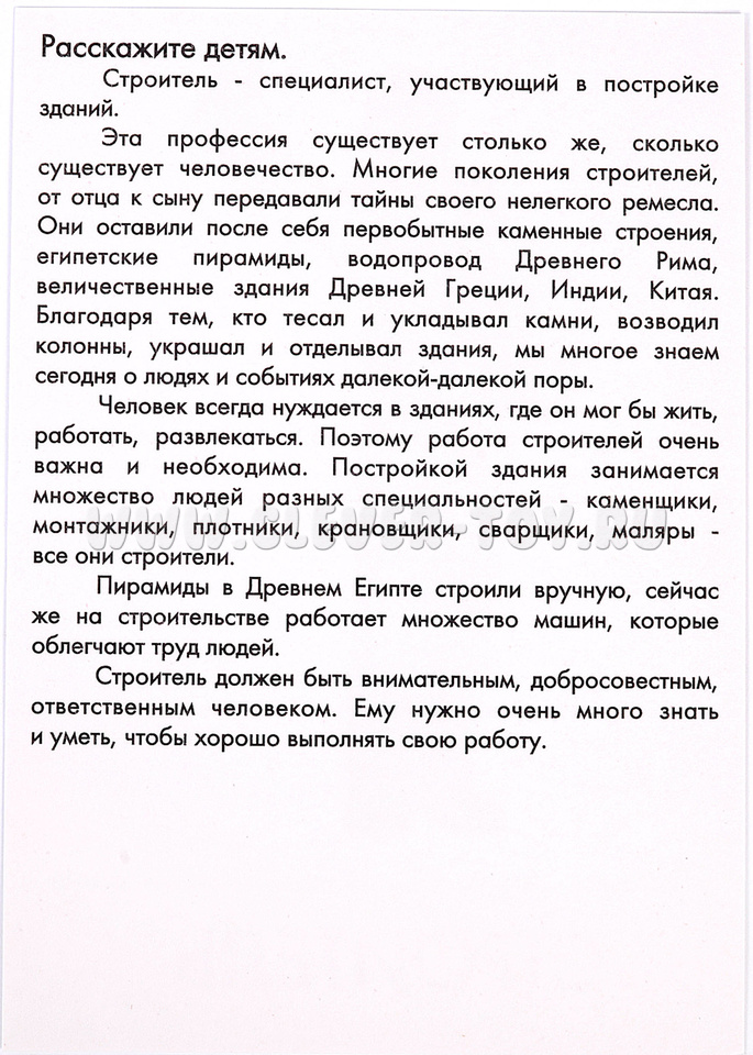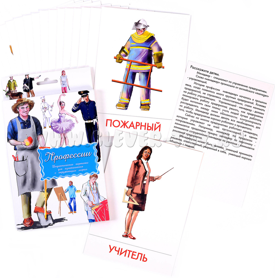 Это пособие является очень удобным дидактическим материалом. Пока ребенок смотрит картинку, Вы рассказываете ему, какая изображена профессия, и как работает человек с данной профессией (на обратной стороне).