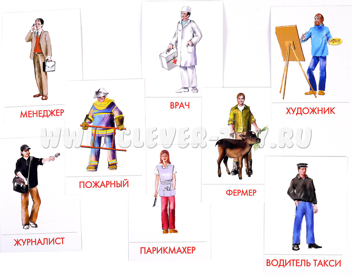 На карточках представлены: балерина, врач, портной, менеджер, инспектор дпс, парикмахер, повар, пожарный, продавец, журналист, садовод, строитель, водитель такси, учитель, фермер, художник.