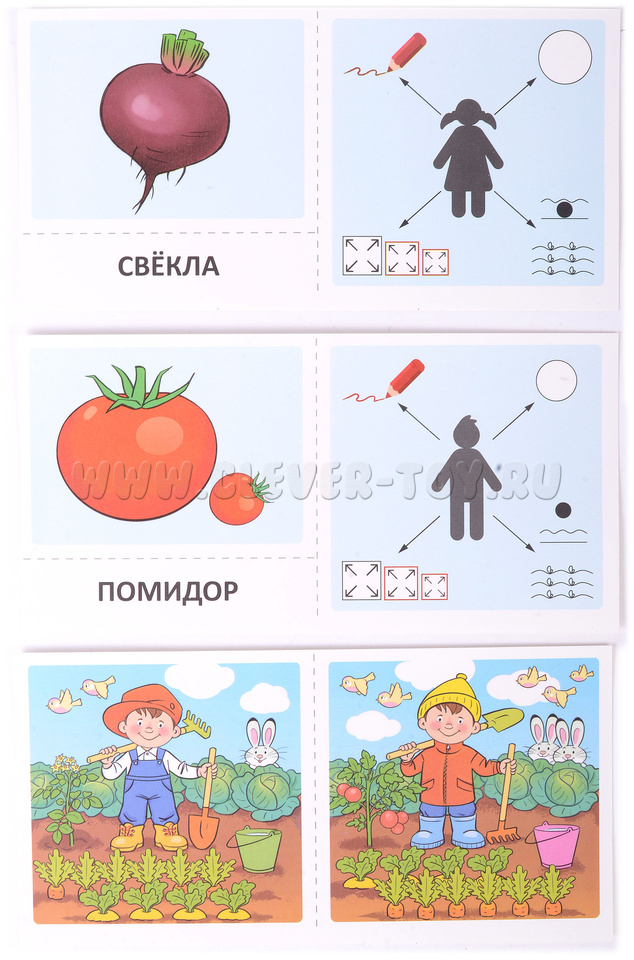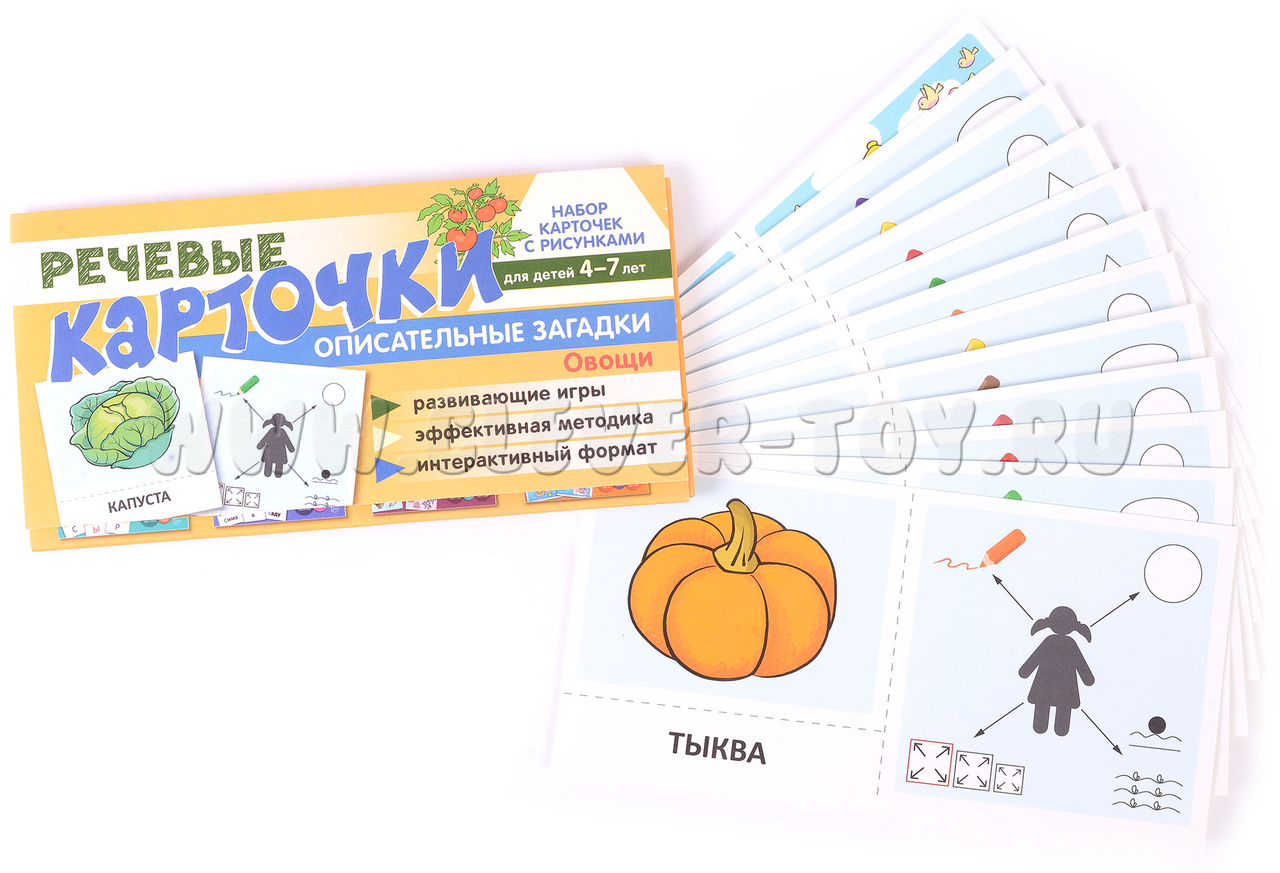 Набор "Речевые карточки. Описательные загадки. Овощи" включает в себя 12 листов с 35 карточками и 4 игры.