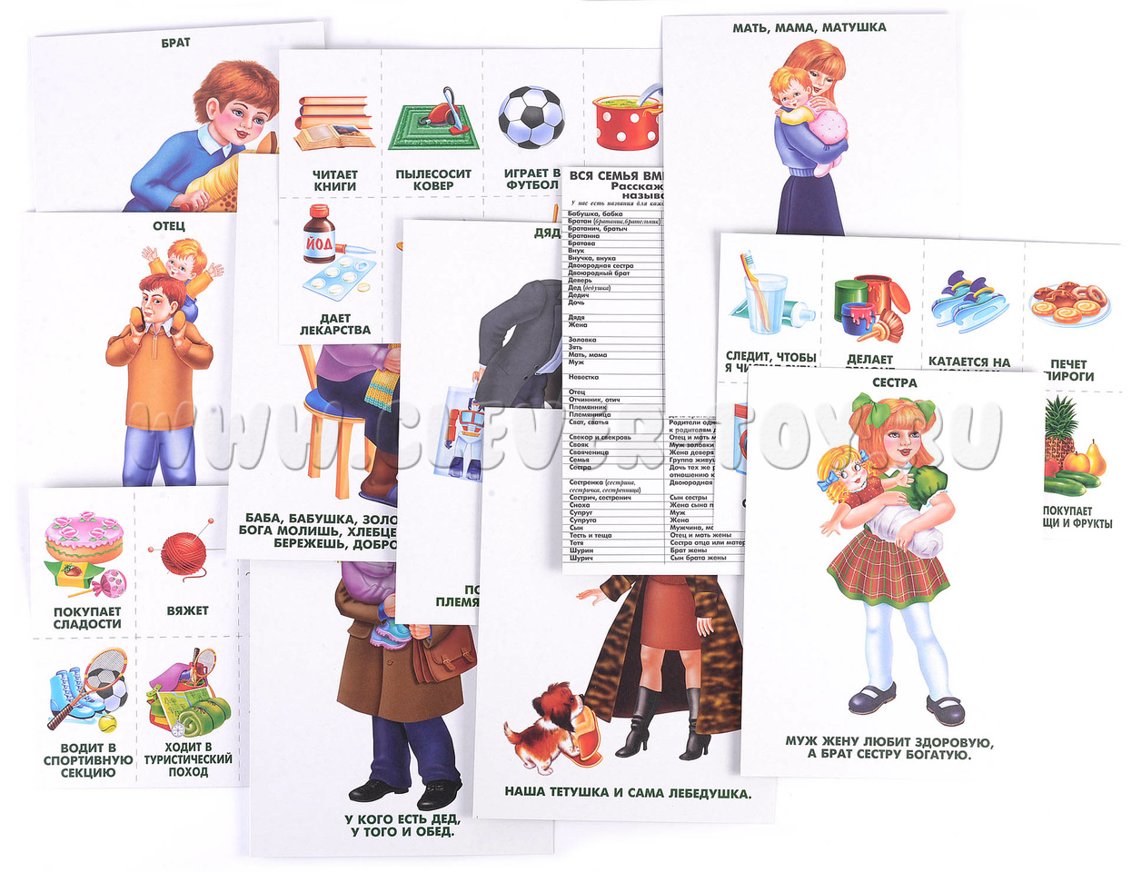 Предлагаем демонстрационный материал, позволяющий рассказать детям о семье. В игровой форме с детьми можно обсудить, что любят их родственники, кто кем кому приходится, кого как зовут, как ребята помогают родным.