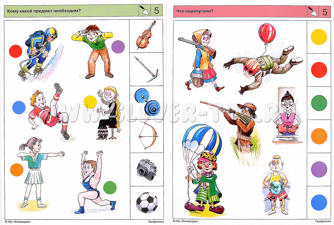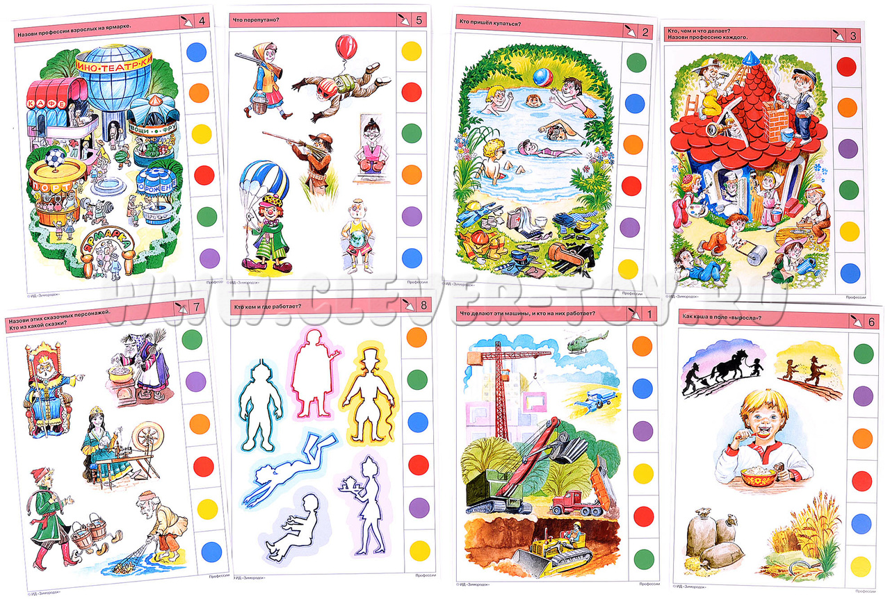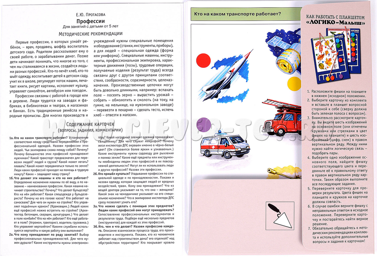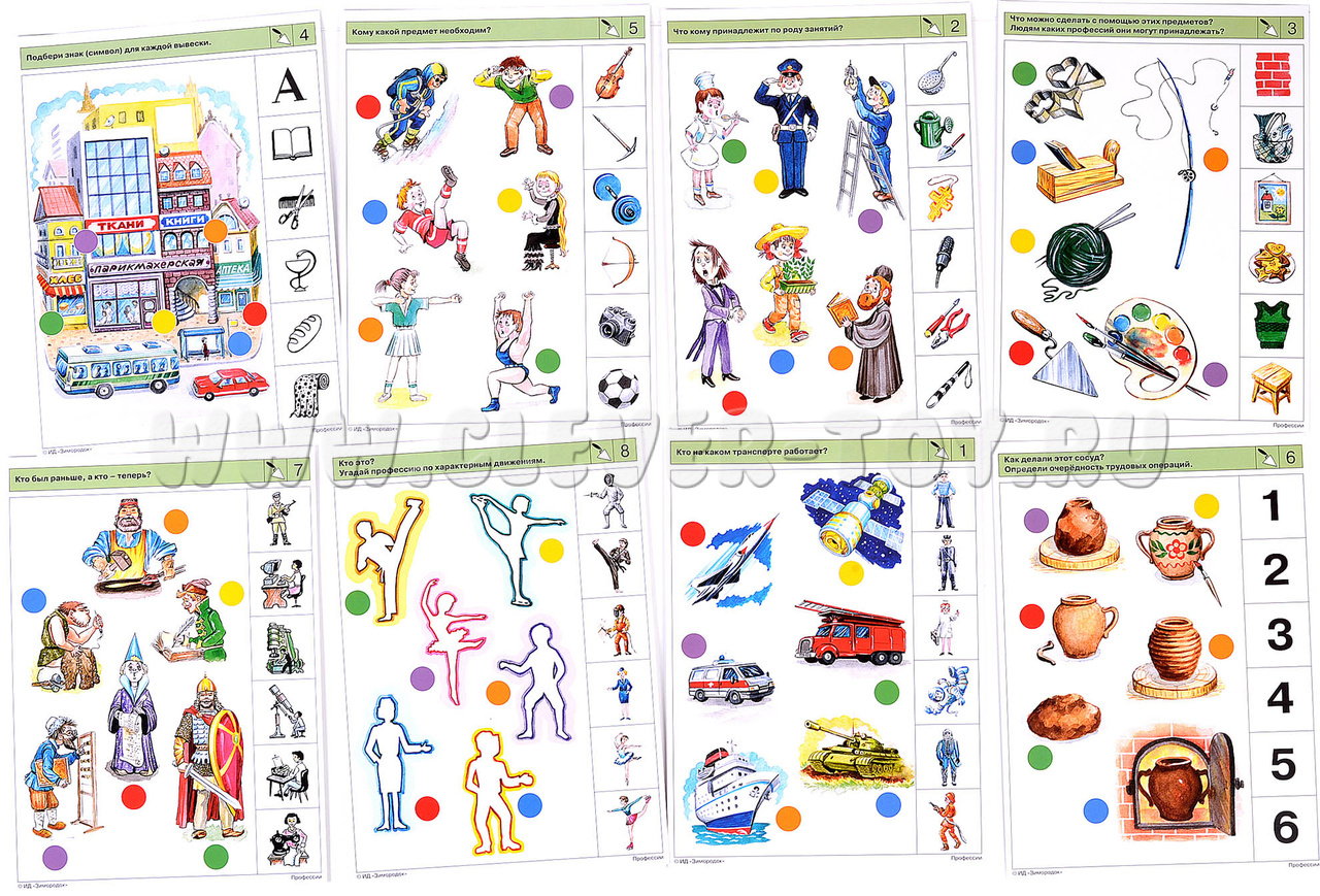 Первые профессии, о которых узнаёт ребёнок, – врач, воспитатель, шофёр, продавец. Родители рассказывают ему о своей работе, о зарабатывании денег. Позже дети начинают понимать, что многое из того, с чем мы сталкиваемся в жизни, создаётся людьми разных профессий. Комплект знакомит ребенка с различными профессиями, традиционными ремеслами и народными промыслами. В процессе решения заданий ребёнок будет находить взаимосвязь между видами профессий и соответствующим им оборудованием и инструментом, специальной одеждой, предметом и результатом труда. Примеры заданий в карточках: 1а. Кто на каком транспорте работает? 1б. Что делают эти машины, и кто на них работает? 2а. Что кому принадлежит по роду занятий? 3а. Что можно сделать с помощью этих предметов? Людям каких профессий они могут принадлежать? 3б. Кто, чем и что делает? Назови профессию каждого.