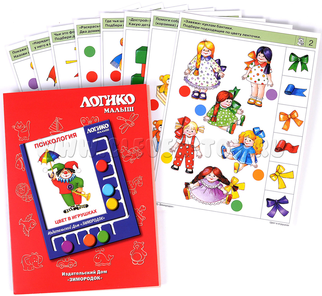 Первое знакомство ребёнка с цветом. Задания комплекта научат малыша узнавать, различать и называть цвета, выбирать целое изображение заданного цвета или его части (цвет мишки и отдельно цвет шапочки на нем), сравнивать изображения по цвету между собой и группировать их по этому важнейшему признаку. Примеры заданий в карточках: 1а. Покажи такую же игрушку, только маленькую. Назови цвет каждой игрушки. 2а. «Завяжи» куклам бантики. Подбери подходящие по цвету ленточки. 3б. Из ниток какого цвета сделан узор на одежде каждого медвежонка 4б. «Поставь» каждую машинку в гараж. 8а. Помоги собрать игрушки. Все игрушки в коробке должны быть разного цвета.