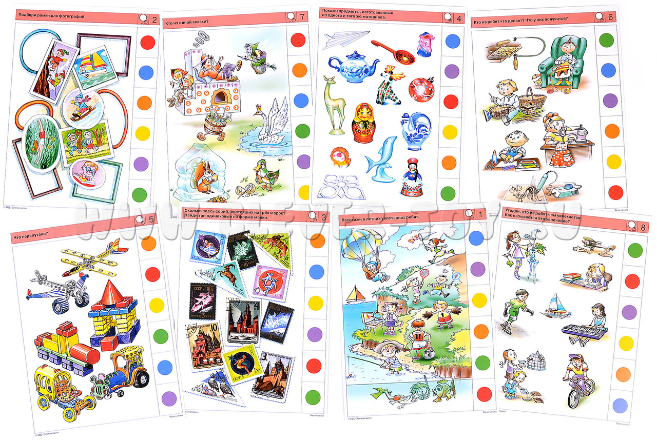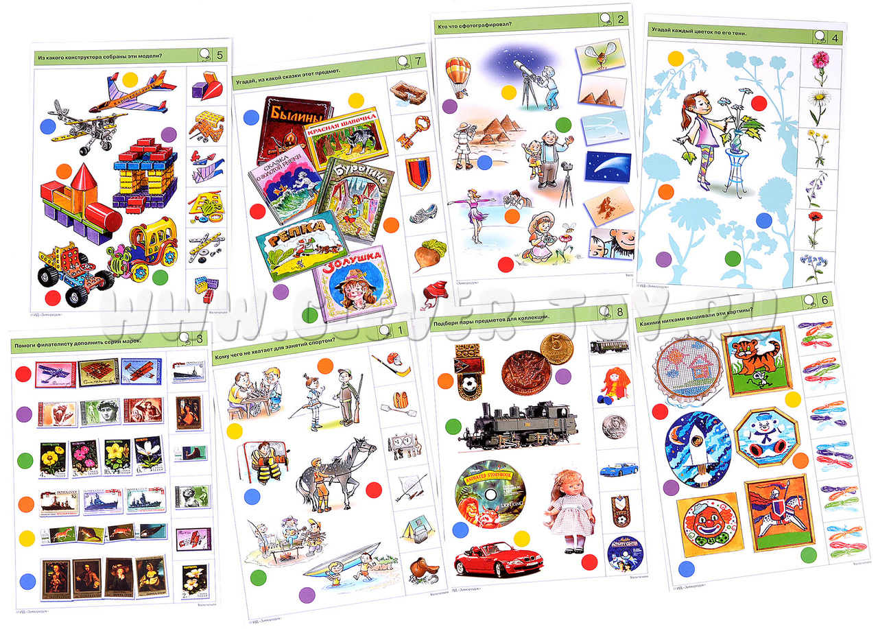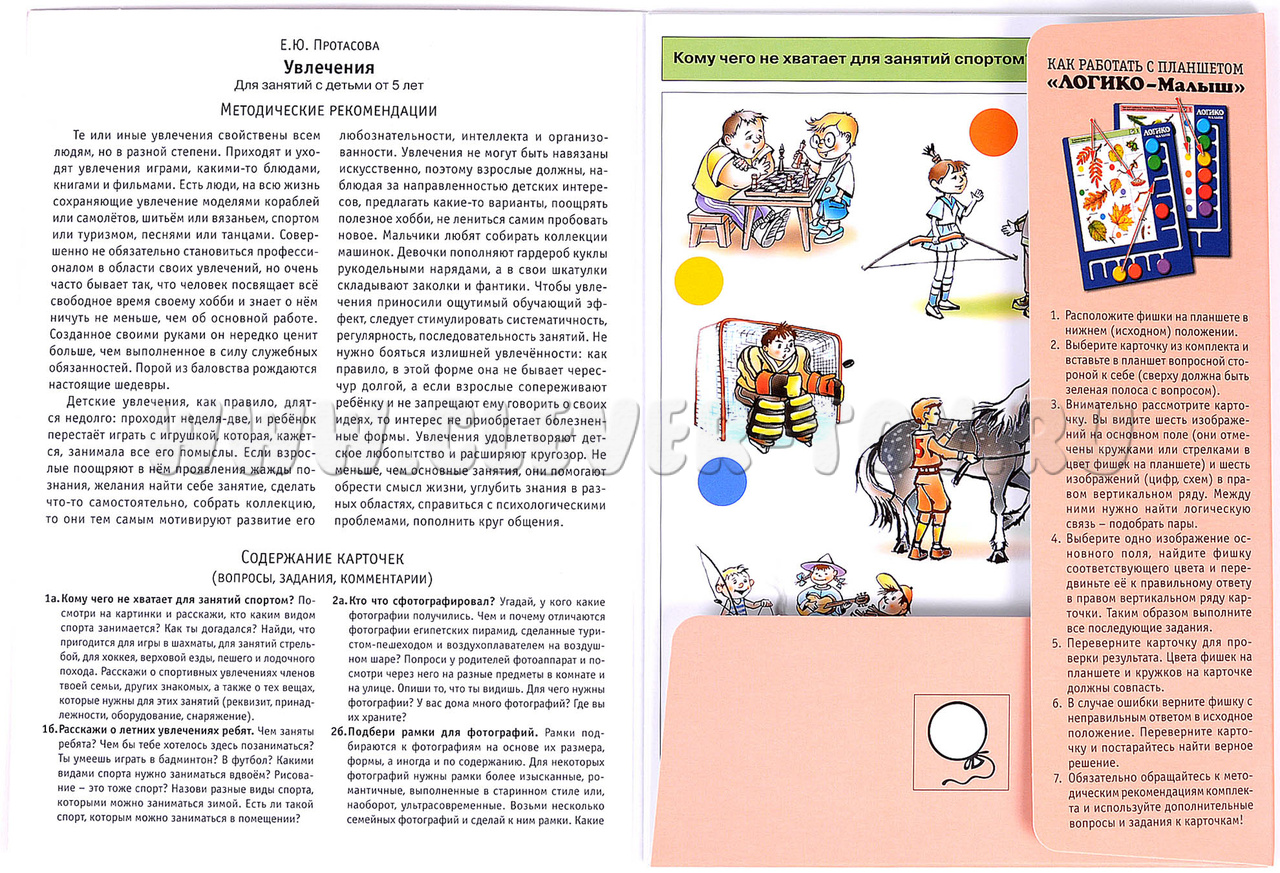 Одни увлечения сопровождают человека на небольшом этапе его жизни, другие человек проносит через всю свою жизнь. Детские увлечения, как правило, длятся недолго: проходит неделя-две, и ребёнок перестаёт играть с игрушкой, которая, кажется, занимала все его помыслы. Но если взрослые поощряют в нём проявления жажды познания, желания найти себе занятие, сделать что-то самостоятельно, собрать коллекцию, то они тем самым мотивируют развитие его любознательности, интеллекта и организованности. Решая задания комплекта, ребёнок познакомится с разными увлечениями, предметами, свойственными для каждого из них, будет дополнять коллекции. Задания активизируют внимание и память ребёнка, развивают его восприятие, мышление в целом. Примеры заданий в карточках: 1а. Кому чего не хватает для занятий спортом? 1б. Расскажи о летних увлечениях ребят. 5а. Из какого конструктора собраны эти модели? 8а. Подбери пары предметов для коллекции. 8б. Угадай, кто из ребят чем увлекается. Как называется это увлечение?