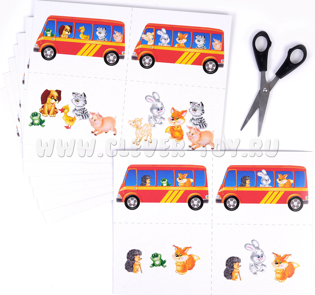В набор входят 8 листов формата А4 с разрезными карточками (по 4 штуки на листе, всего 32 шт.). Перед началом игры родителю или педагогу необходимо разрезать карточки по пунктирным линиям. Предложите ребенку самостоятельно или с вашей помощью подобрать к карточке с автобусом полностью соответствующую ей карточку с пассажирами. Попросите назвать пассажиров. Если играет компания детей, раздайте им поровну карточки с автобусом и показывайте карточки с пассажирами самостоятельно. Пусть ребенок, которому подходит карточка, забирает ее себе. Тот, кто быстро и правильно подберет подходящие карточки, побеждает.