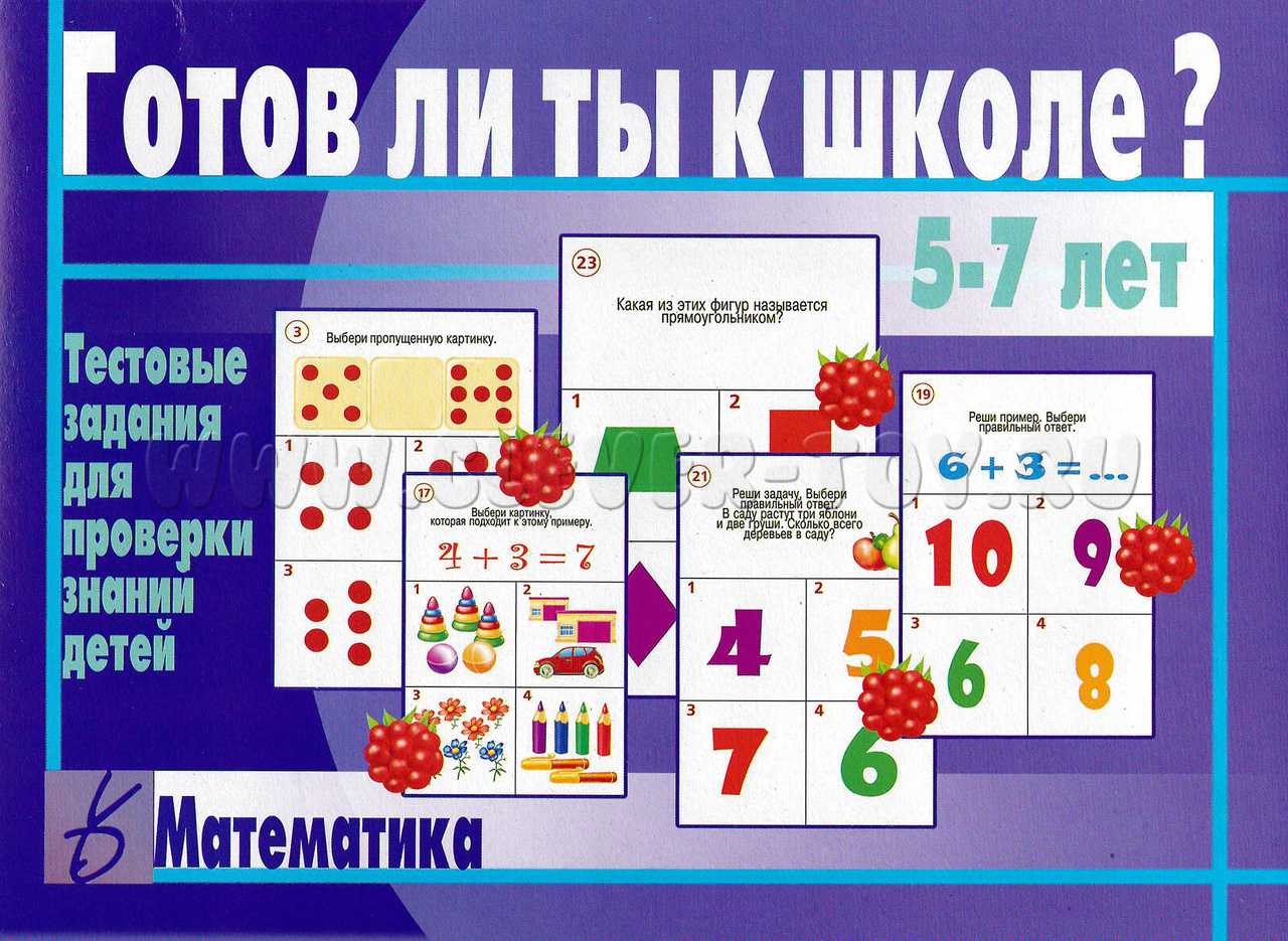 Тестовые задания для проверки знаний по математике перед поступлением в школу. Перед началом занятий требуется разрезать карты по пунктирным линиям (получится 24 карточки с заданиями и 24 с картинками).