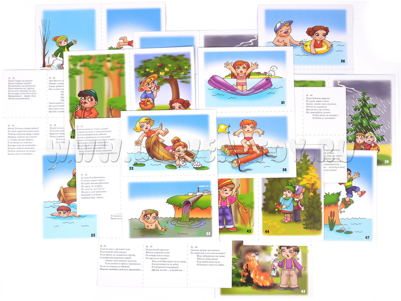 • Раздайте детям поровну картинки-иллюстрации. Начните зачитывать стихотворения. Игрок, чья картинка соответствует содержанию стихотворения, забирает карточку с ним себе и объясняет, как избежать опасной ситуации и выйти из нее, если ситуация все же случилась;