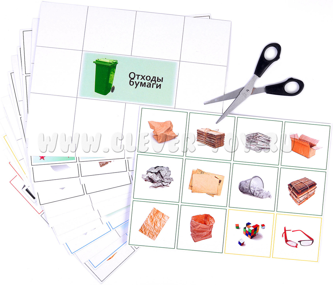- Подготовьте 5 игровых полей с изображениями контейнеров для раздельного сбора отходов и разрезные карточки к ним. Карточки перемешайте. Перед началом игры обсудите с ребенком значимость раздельного сбора мусора, назначение контейнеров и сортировку отходов. Лучшим примером станут ваши собственные действия. После беседы предложите ребенку разложить карточки на подходящие игровые поля (для проверки можно ориентироваться на единую цветовую схему поля и карточек);