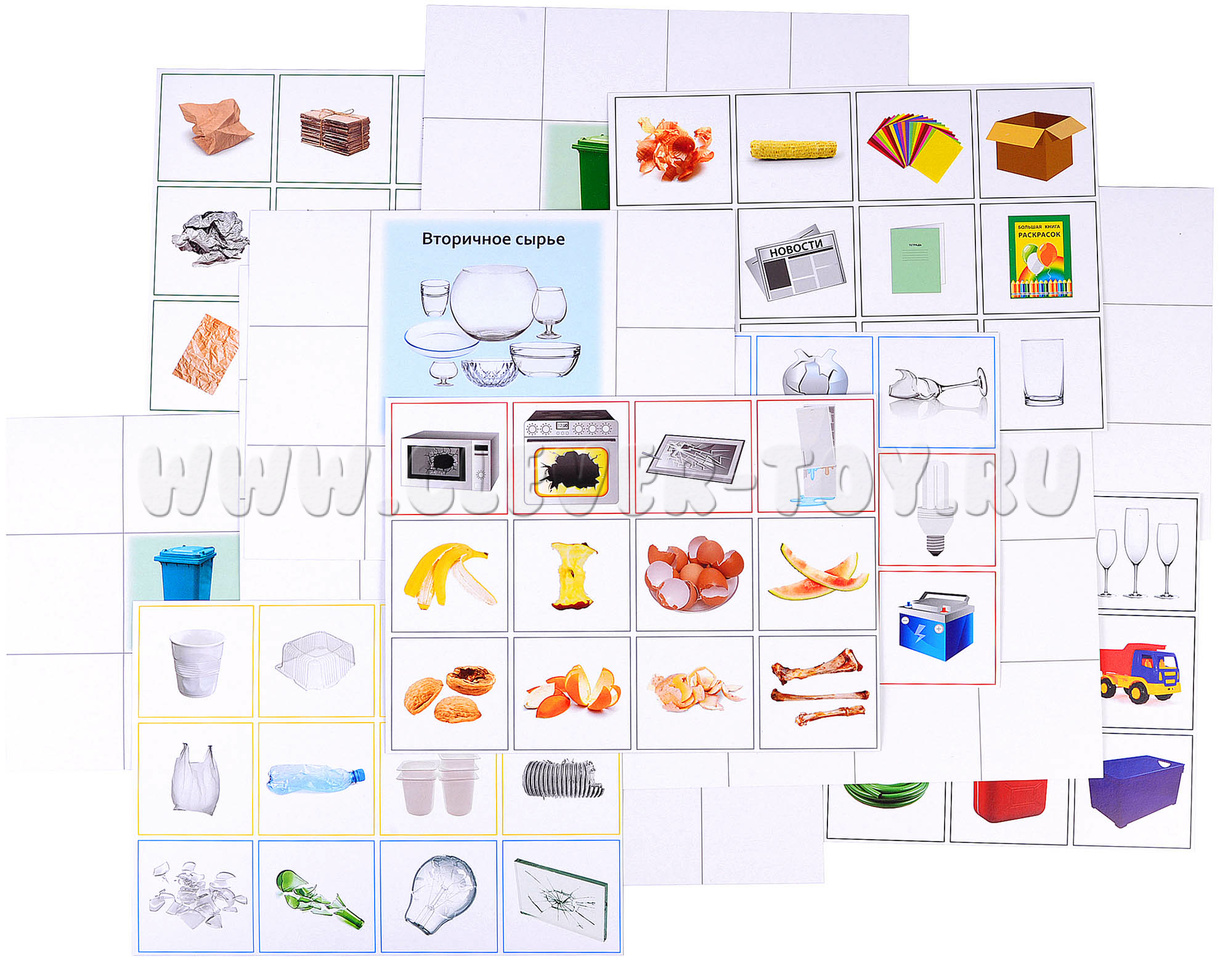 - Подготовьте 3 игровых поля "Вторичное сырье" и карточки к ним. Перед началом игры побеседуйте с ребенком о необходимости переработки и повторного использования отходов в качестве вторичного сырья. Перемешайте карточки и предложите малышу самостоятельно распределить их на 3 категории: переработку пластика, стекла и бумаги;