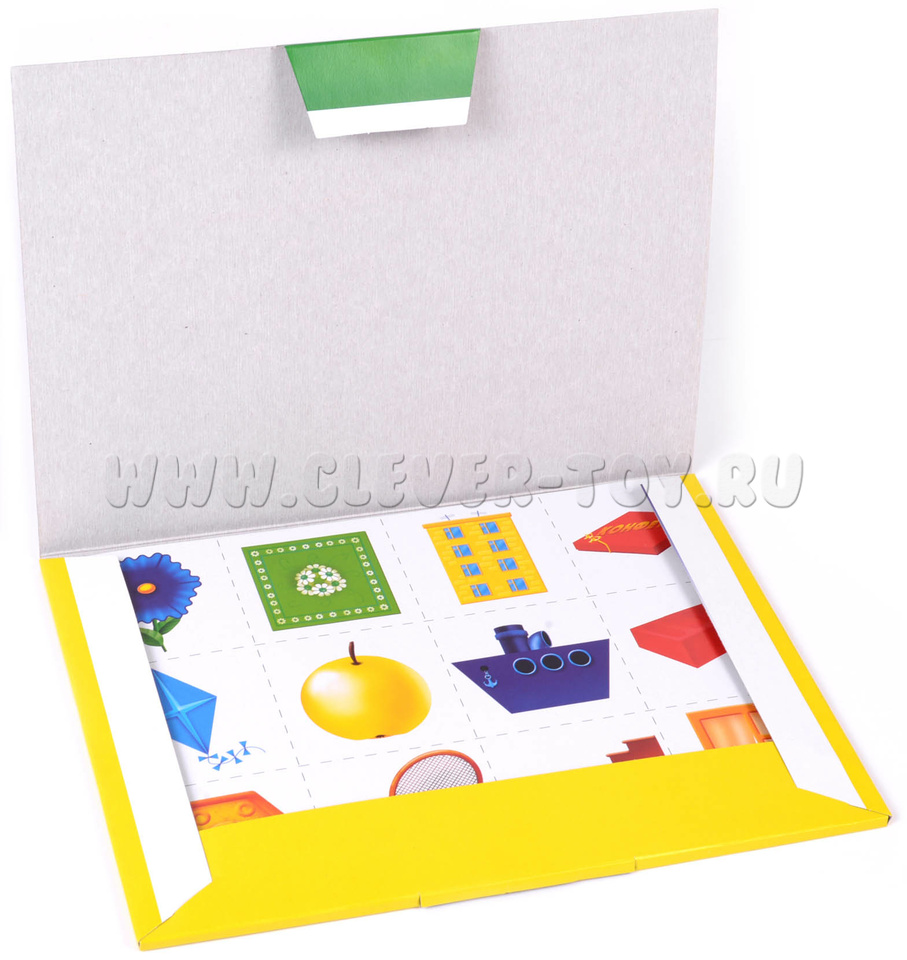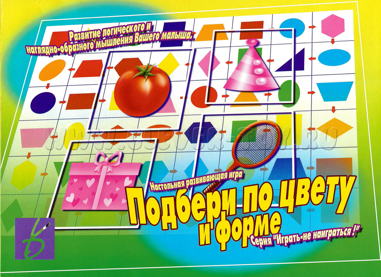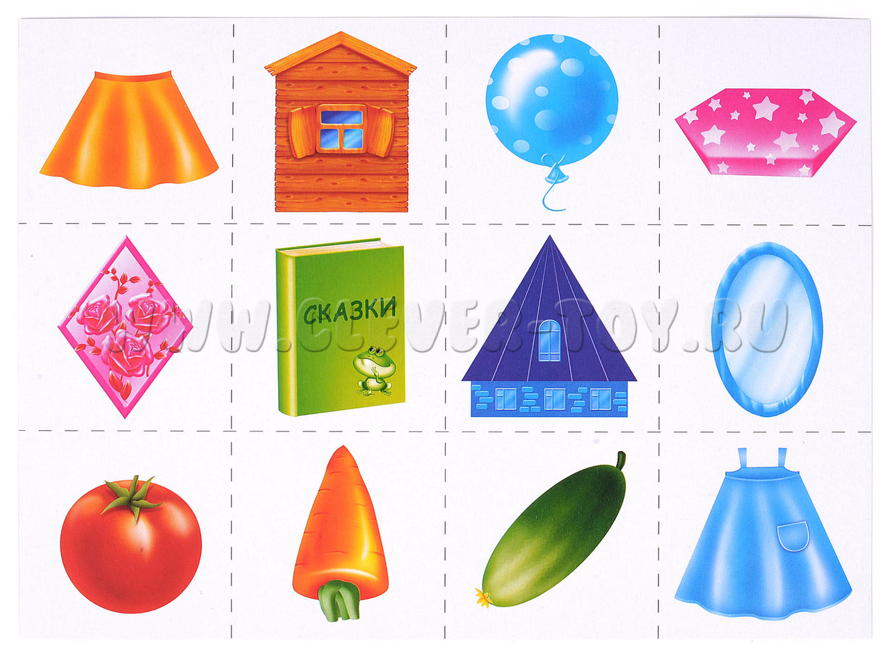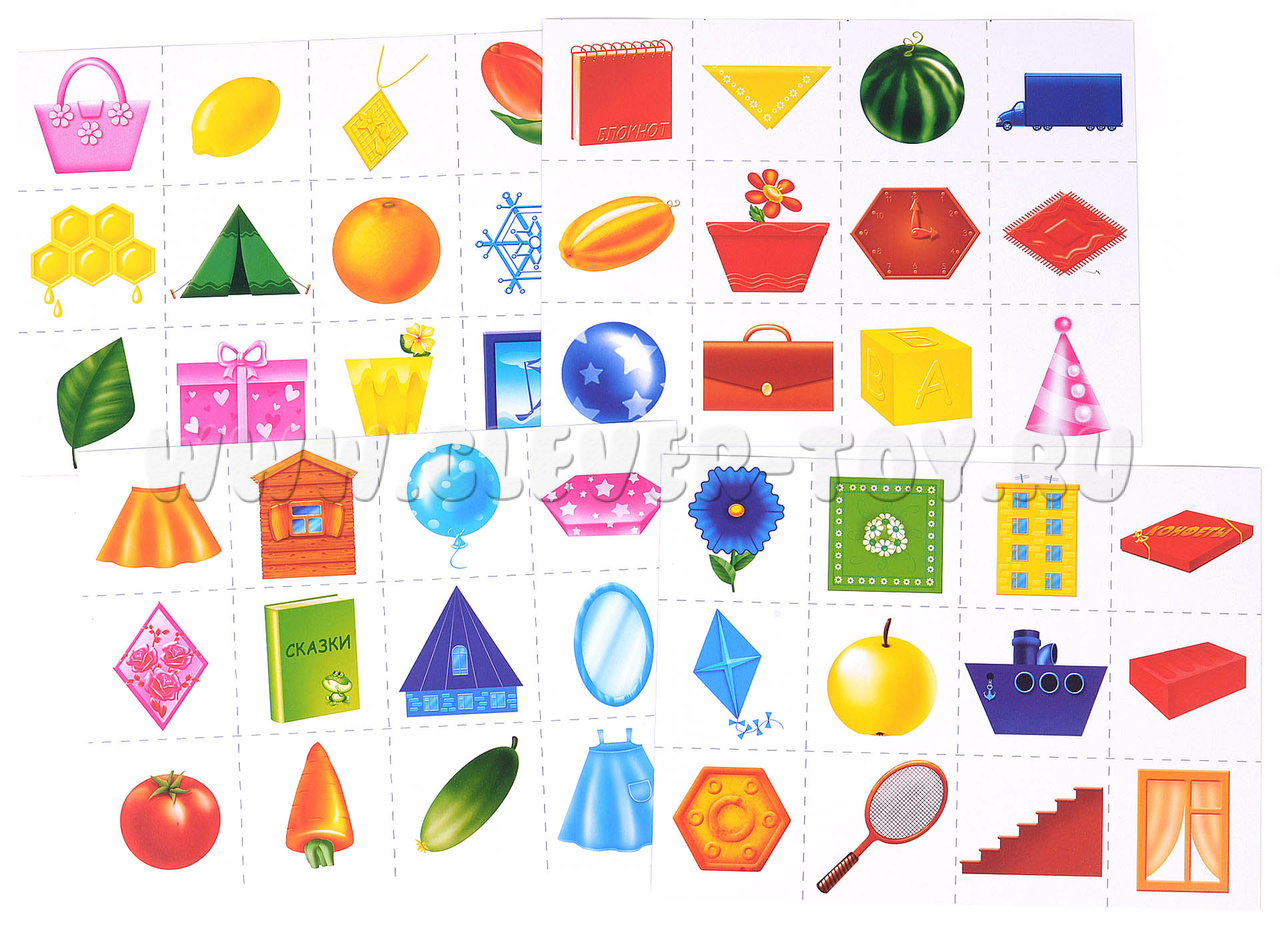 Игра включает в себя большое игровое поле и 4 разрезных карты с предметами разных форм и цветов. Перед началом игры разрежьте карты по пунктирным линиям. Получится 48 карточек с картинками. Карточки перемешайте и раздайте участникам поровну. Игроки должны выложить свои карты стопкой картинками вниз. Случайным образом выбирается тот, кто начинает игру. Начинающий берет верхнюю карточку из своей стопки и проверяет, подходит ли предмет на его карточке по цвету или форме к первой клетке игрового поля. Если да – карточка выкладывается на клетку поля, если нет – карточку откладывают в сторону. Следующий участник поступает аналогичным образом со следующей клеткой поля. Участник имеет право на ход вне очереди, если фигура на его карточке подходит к фигуре на поле и по цвету, и по форме. Если у игрока в стопке закончились карточки, он может использовать те, что были отложены в сторону. Если подходящей карточки нет, участник пропускает ход. Побеждает тот, кто первым выложит все свои карточки на игровое поле.