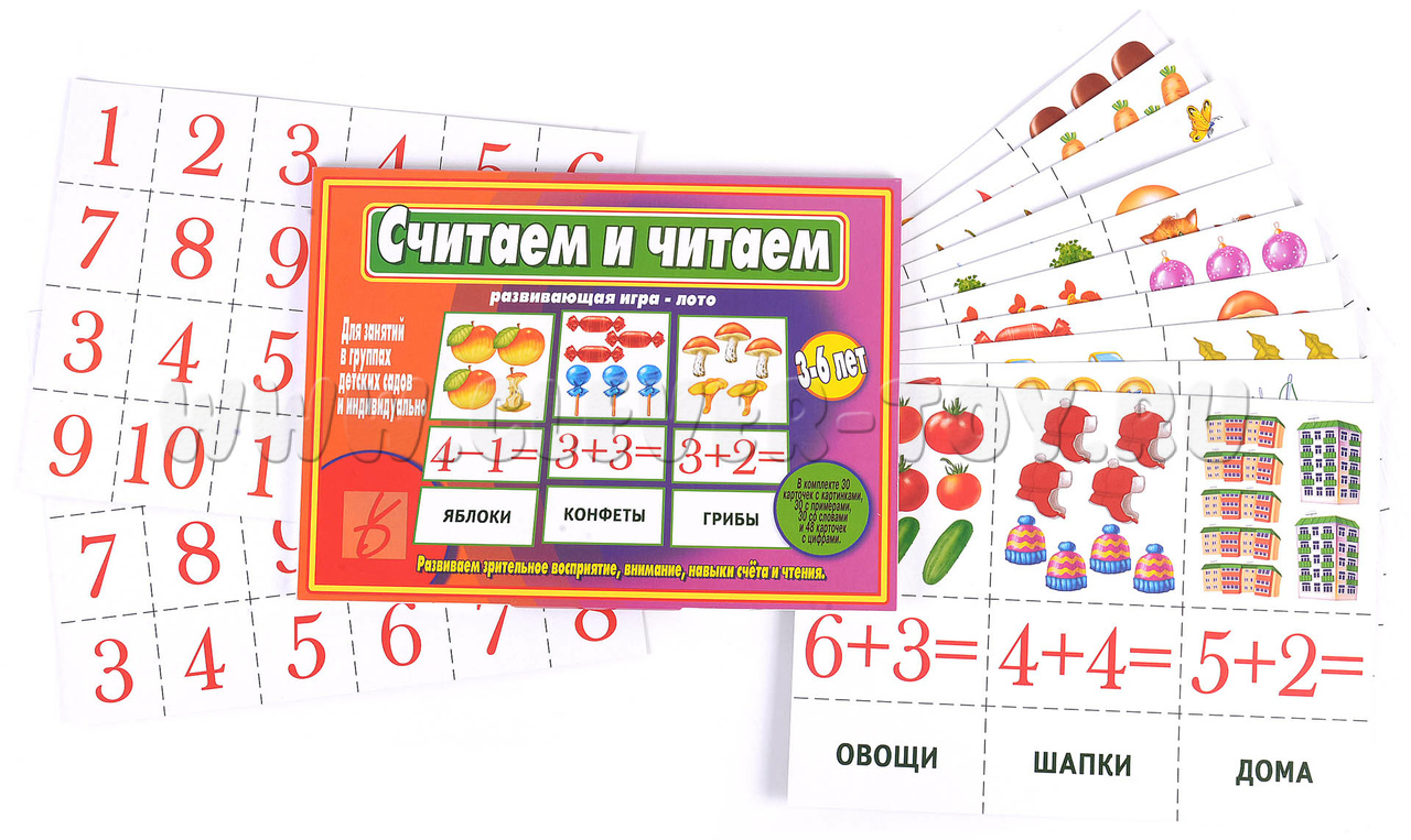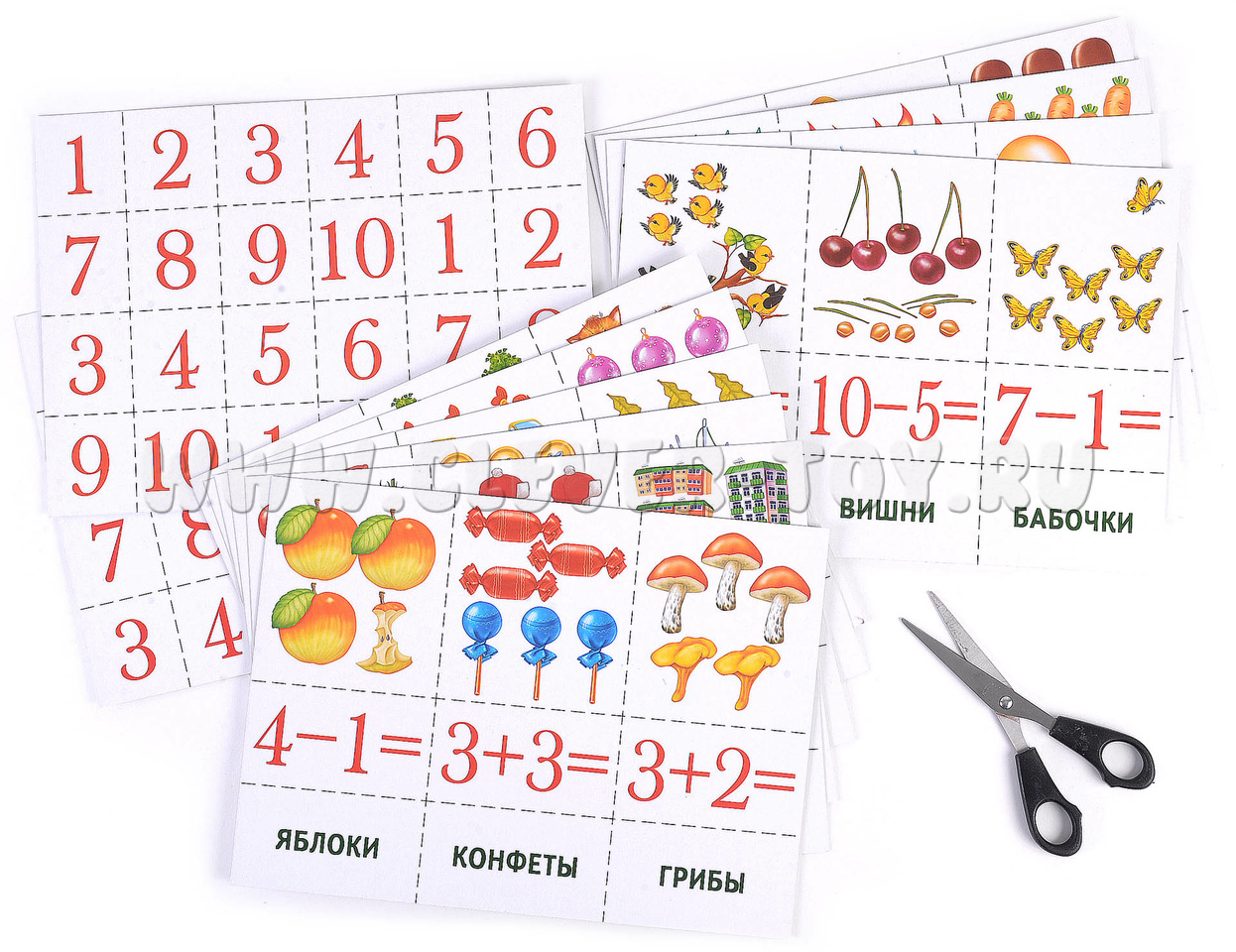 Разрежьте карты по пунктирным линиям. У вас получится 30 карточек с картинками, 30 карточек с примерами, 30 карточек со словами и 48 карточек с цифрами.