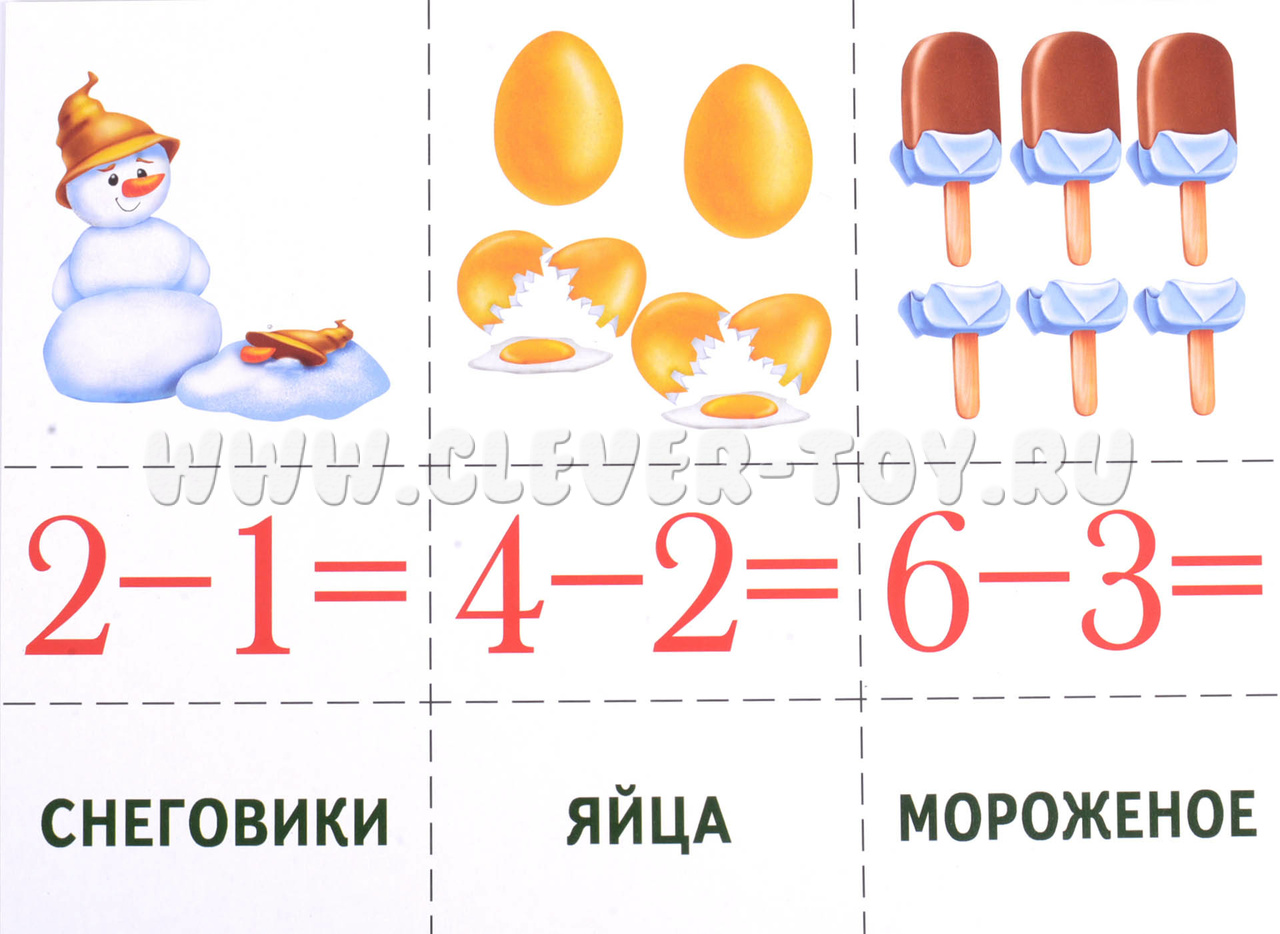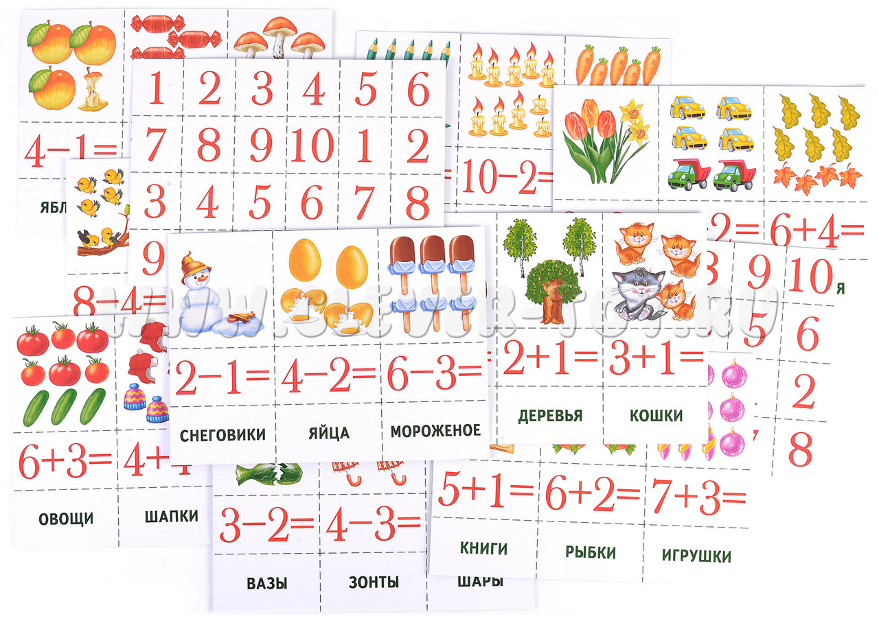 1. Раздайте детям карточки с картинками поровну. Предложите подобрать к каждой карточке подходящий пример на сложение или вычитание, решить этот пример и подобрать подходящую цифру. Также к каждой картинке нужно подобрать подходящее слово.
