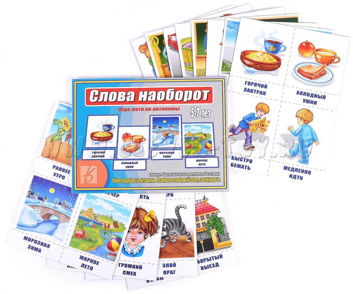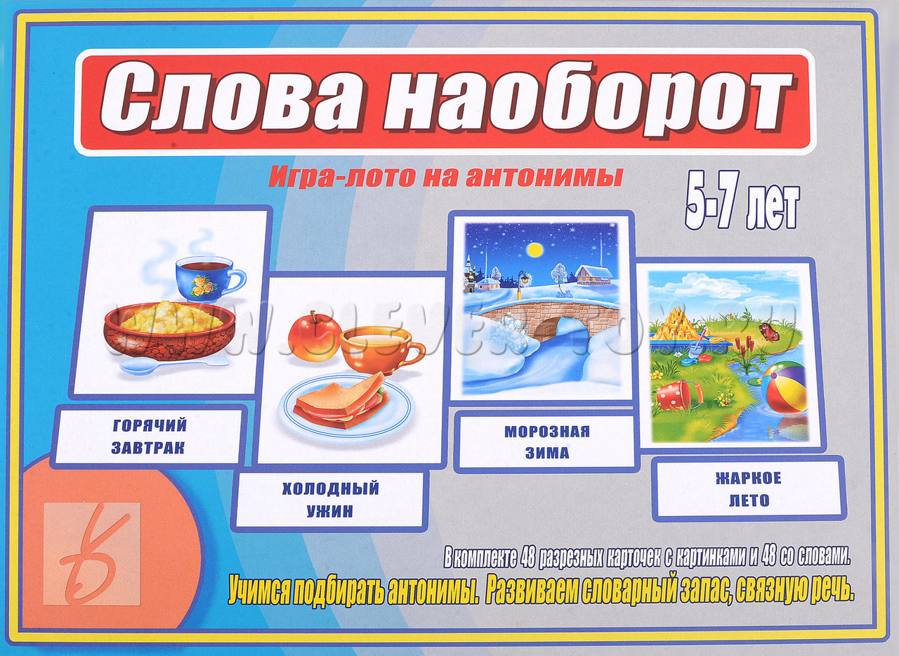 Игра - лото на антонимы "слова наоборот", расчитана на возраст 5 - 7 лет. Данная игра помогает научиться детям правильно употреблять в речи слова с противоположными значениями.