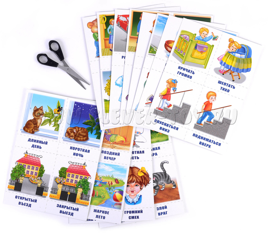 1. Раздать детям 24 карточки со словами, поровну. Ведущий показывает карточки с антонимами. Если дети не умеют читать, то взрослый читает сам. Дети подбирают карточки парами, а потом находят подходящие пары картинок.