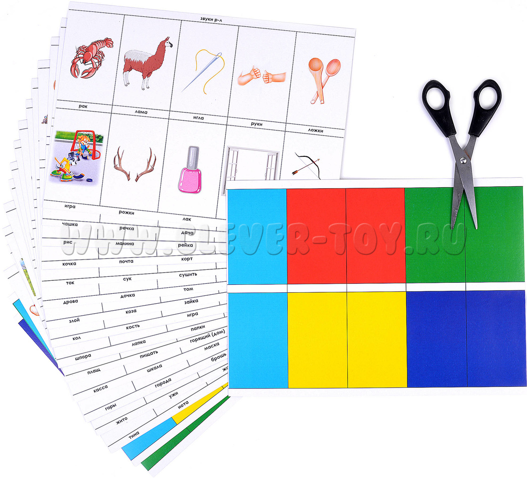 Набор включает в себя 14 игровых полей (5 пар слов с картинками на каждом) и 3 листа А4 с цветными разрезными карточками (используются в качестве вспомогательного материала при организации игрового процесса). Перед началом игры цветные карточки необходимо вырезать.
