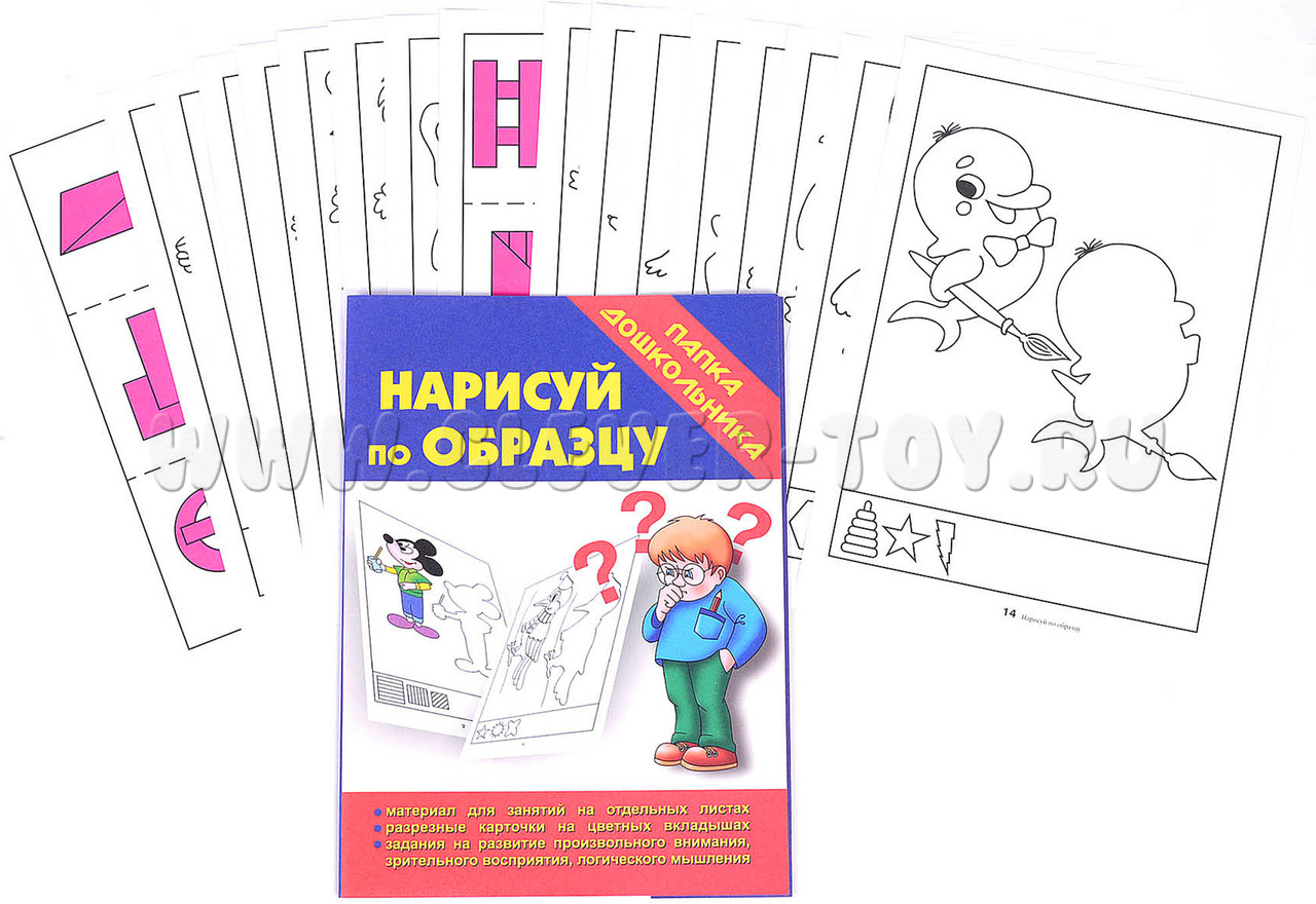 Задание для ребенка - воссоздать большой рисунок в первоначальном виде, срисовывая с образца. Внизу каждого листа есть маленькие рисунки, которые тоже необходимо полностью повторить.