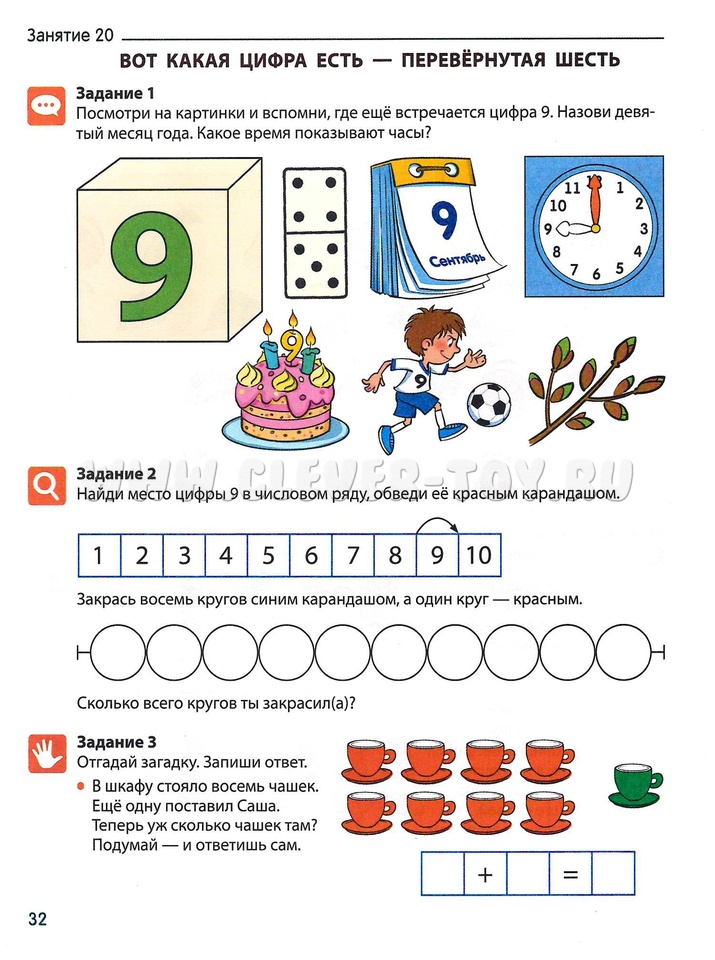 Задания в ней направлены на овладение ребенком навыками счёта, умением применять его для определения количества, на ознакомление с геометрическими предметами, развитие способностей ориентироваться во времени и пространстве.