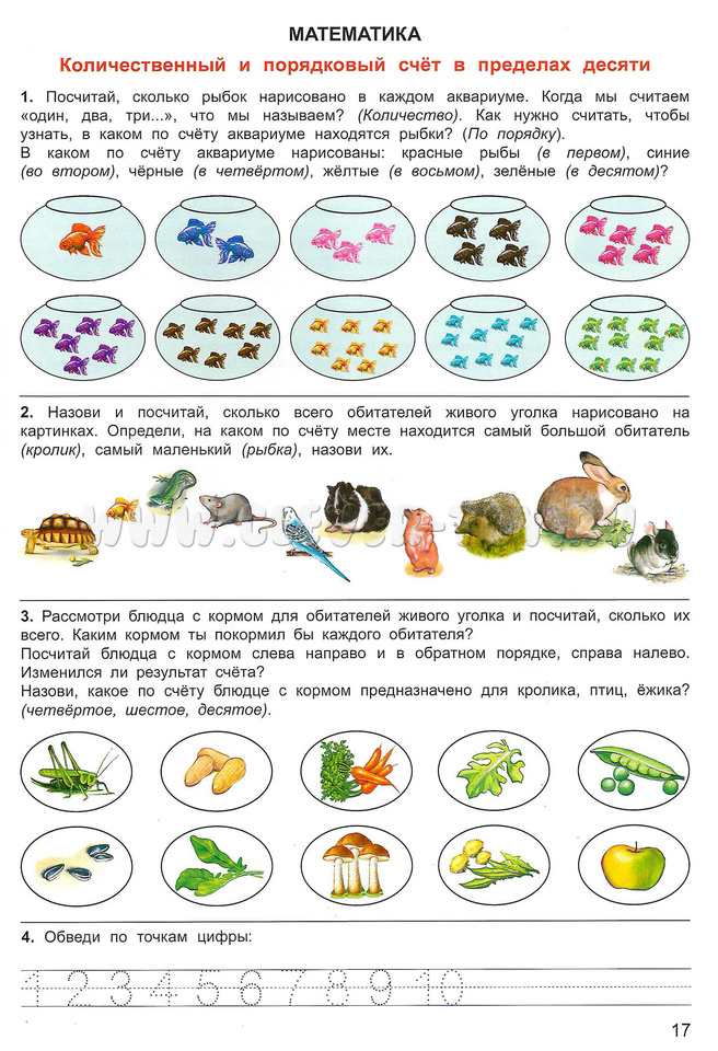 • Математика (количественный и порядковый счёт в пределах десяти).