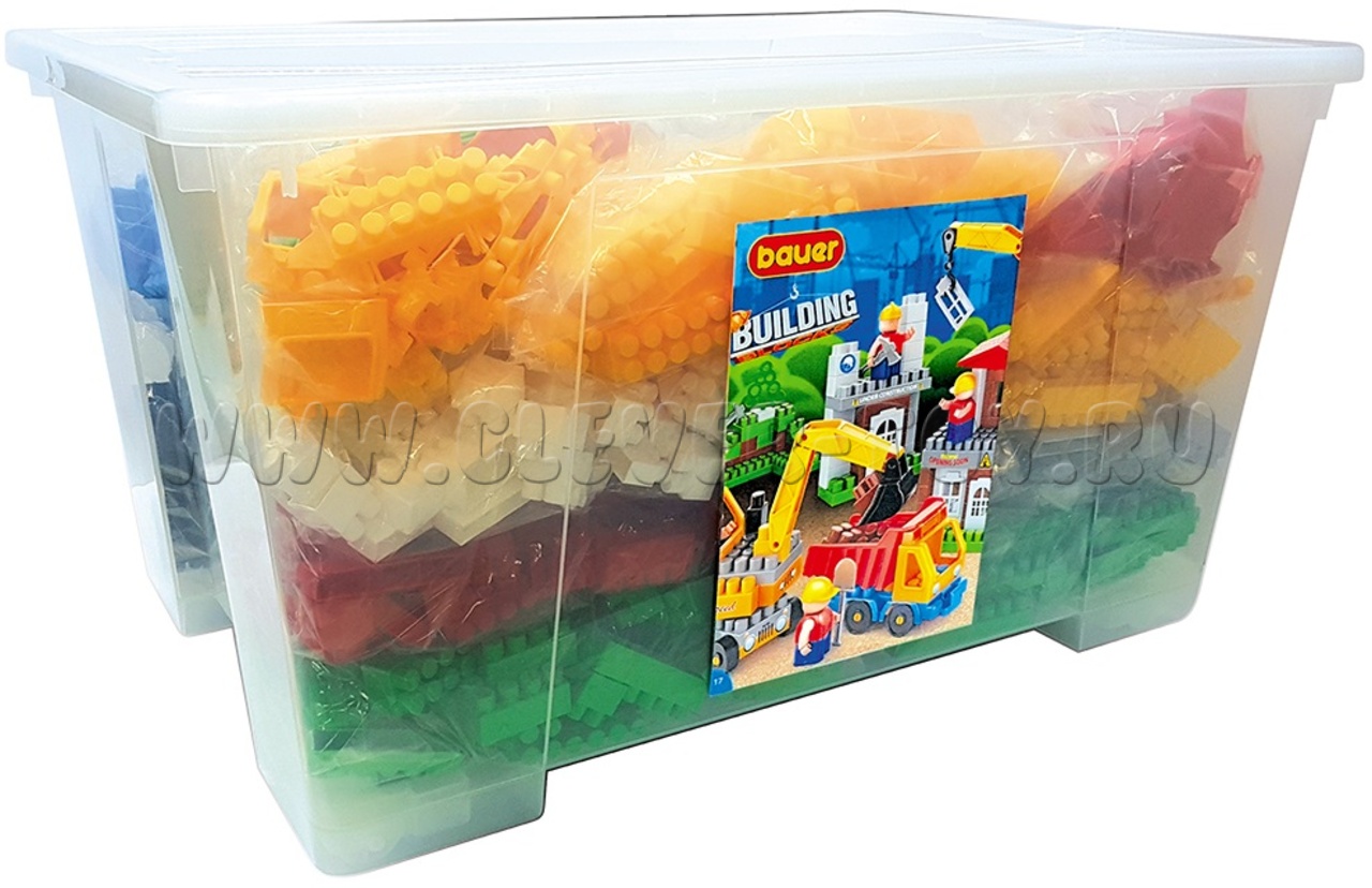 Набор серии «Стройка» совместим с другими наборами от BAUER. В комплект входят: кубики различных цветов и размеров, сборная строительная техника, сборные машинки, фигурки человечков и набор инструментов для них, набор наклеек "Дорожные знаки", элементы декора (дорожные знаки, деревья, светофоры, забор, окна, двери, крыши). Конструктор созданн из безопасного пластика с использованием пищевых красителей.