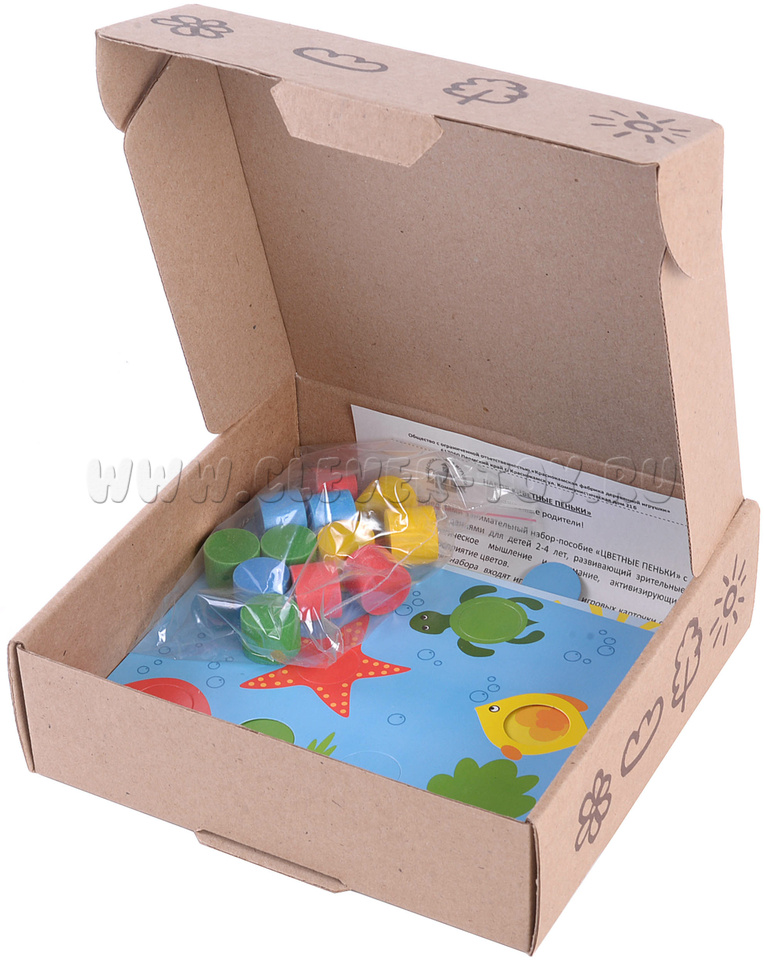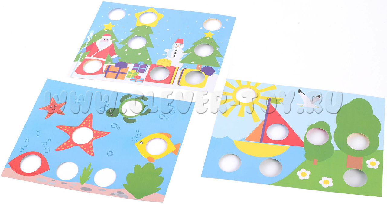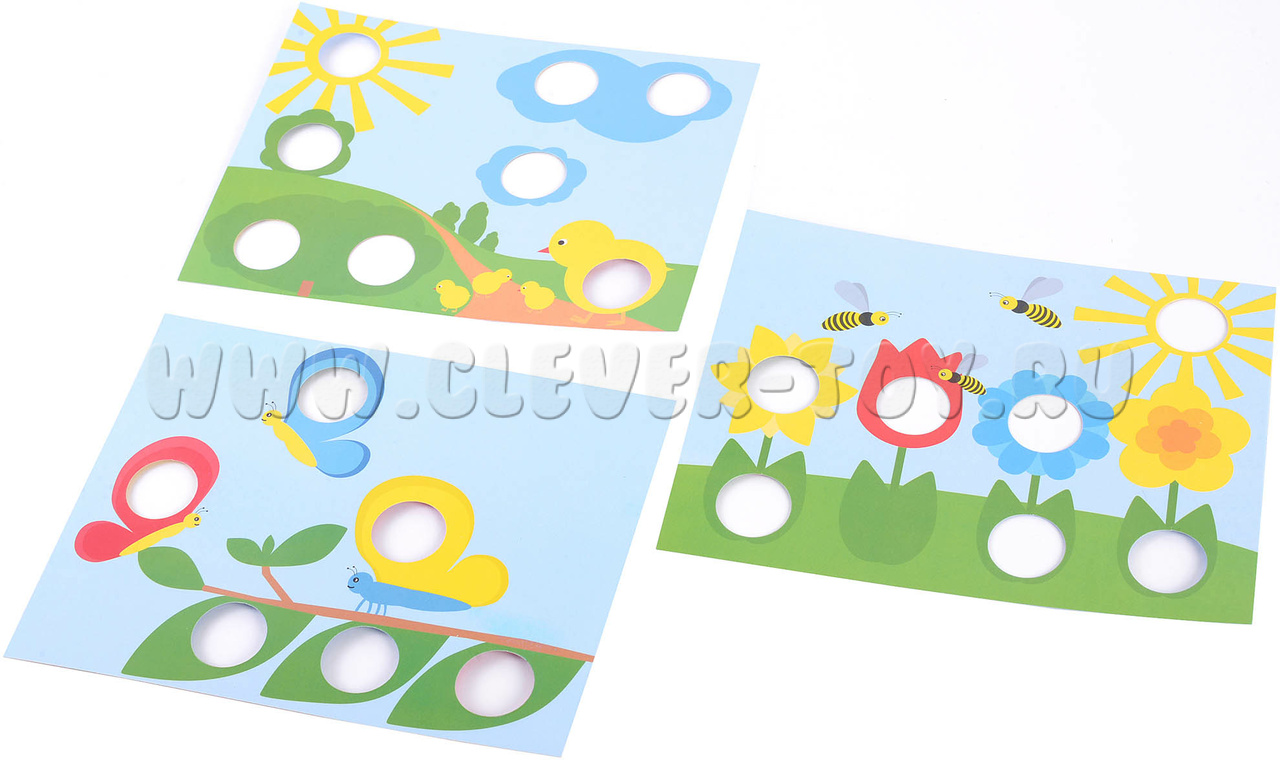 • 3 карточки с шестью заданиями (двусторонние карточки с яркими изображениями бабочек, цветочной полянки, цыплят, морского дна, кораблика и праздника «Новый год»);