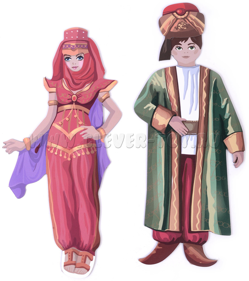 В наборе – магнитные мальчик и девочка в купальных костюмах (кстати, кукол можно крепить на магнитной доске) и шесть вариантов национальных костюмов: русского, украинского, грузинского, узбекского, греческого, арабского.